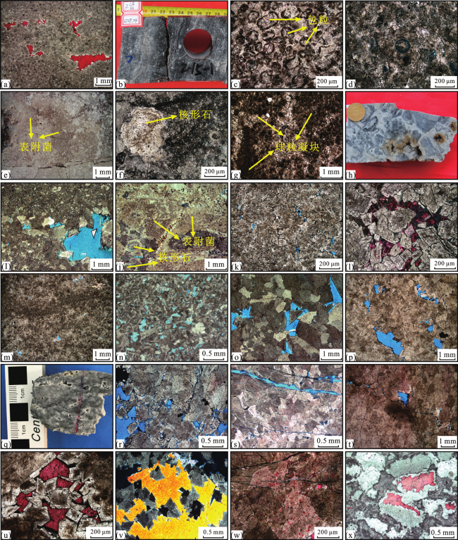 图2 古城地区上寒武统白云岩储层岩石类型及储集空间特征(a)古城8井,6 733.51 m,残余砂屑结构粉晶云岩,水平分布的粒间溶孔、溶蚀孔洞方解石充填,铸体薄片,(—);(b)城探2井,6 729.74 m,残余包粒结构粉晶云岩,岩心;(c)城探2井,6 734.01 m,残余包粒结构粉细晶云岩,铸体薄片,(—);(d)城探1井,6 890.78 m,残余鲕粒结构粉晶云岩,铸模孔,铸体薄片,(—);(e)城探1井,6 888.28 m,硅化表附菌白云岩,普通薄片,(—);(f)城探1井,6 888.28 m,含核形石粉晶云岩,核形石被硅化,铸体薄片,(—);(g)城探1井,7 125.6 m,残余砂屑球粒凝块结构细晶云岩,铸体薄片,(—);(h)城探1井,6 876.9 m,角砾云岩,溶蚀孔洞发育,岩心;(i)城探1井,6 923.46 m,角砾云岩,角砾成分为残余颗粒结构粉晶云岩,溶蚀缝洞中2期白云石充填,铸体薄片,(—);(j)城探1井,6 875.43 m,角砾云岩,角砾成分为硅化表附菌粉晶云岩,见核形石,铸体薄片,(—);(k)古城8井,6 732.2 m,细中晶云岩,晶间孔发育,铸体薄片,(—);(l)古城15井,4-1/38,粗晶云岩,见鞍状白云石,晶间孔发育,连晶方解石充填,铸体薄片,(—);(m)城探1井,6 879.48 m,残余颗粒结构粉晶云岩,粒间溶孔,铸体薄片,(—);(n)城探2井,6 729.50 m,残余包粒结构粉晶云岩,粒内溶孔,铸体薄片,(—);(o)古城8井,6 735.05 m,中粗晶云岩,晶间孔,铸体薄片,(—);(p)古城8井,6 734.5 m,粗晶云岩,溶蚀孔洞、晶间溶孔,铸体薄片,(—);(q)古城8井,6 732.51 m,粗晶云岩,溶蚀孔洞,岩心;(r)古城15井,6 997.35 m,粗晶云岩,溶蚀缝、溶蚀孔洞,铸体薄片,(—);(s)古城15井,7 000.55 m,中粗晶云岩,构造缝、晶间孔,铸体薄片,(—);(t)古城8井,6 734.1 m,粗晶云岩,沿缝合线发育孔隙,铸体薄片,(—);(u)古城15井,7 001.75 m,粗晶云岩,白云石见环带结构,晶间方解石充填,铸体薄片,(—);(v)古城15井,6 997.35 m,中粗晶云岩,溶洞重晶石充填,铸体薄片,(—);(w)城探1井,6 888.05 m,粗晶云岩,去白云石化,铸体薄片,(—);(x)城探2井,6 733.05 m,残余包粒结构粉晶云岩,溶蚀孔硅质、方解石充填,铸体薄片,(—) Fig.2 Petrology and reservoir space of dolostone in Upper Cambrian of Gucheng area |