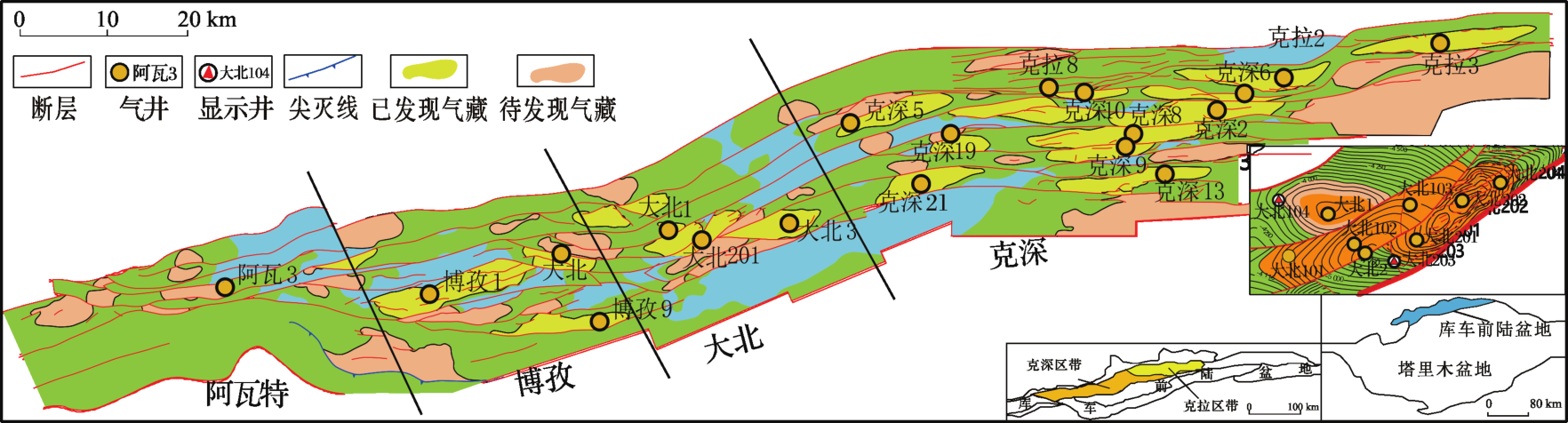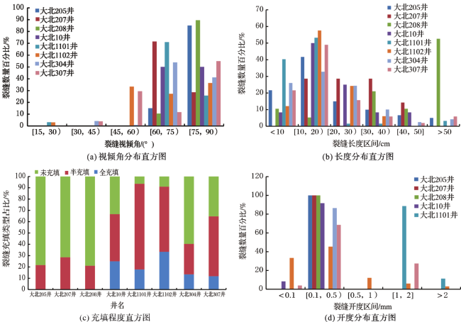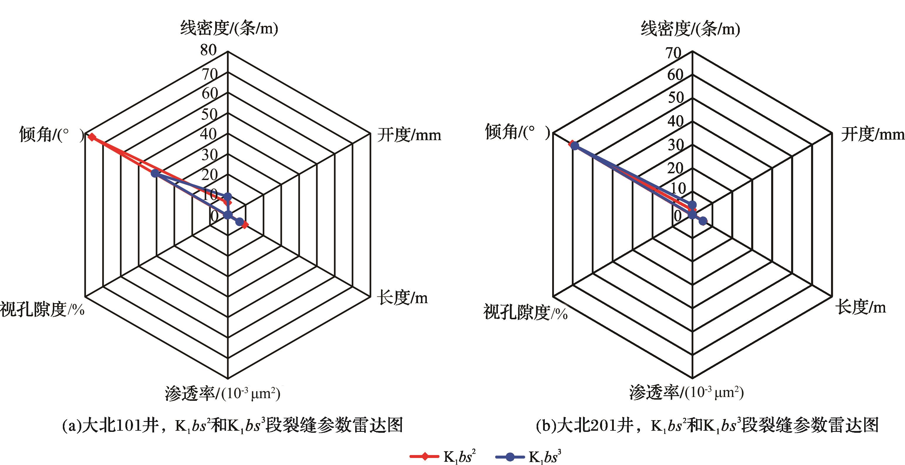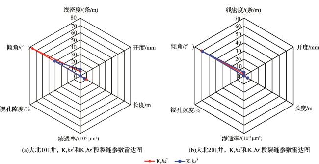 图8 塔里木盆地库车坳陷克拉苏构造带大北地区大北1井和大北201井区不同构造部位K1 bs成像测井解释裂缝参数Fig.8 Figures showing fracture parameters of K1 bs in ty-pical well blocks Dabei 1 and Dabei 201 located in differ-ent position of fault anticline by imaging logging interpre-tation, Dabei region of Kuqa Depression, Tarim Basin |