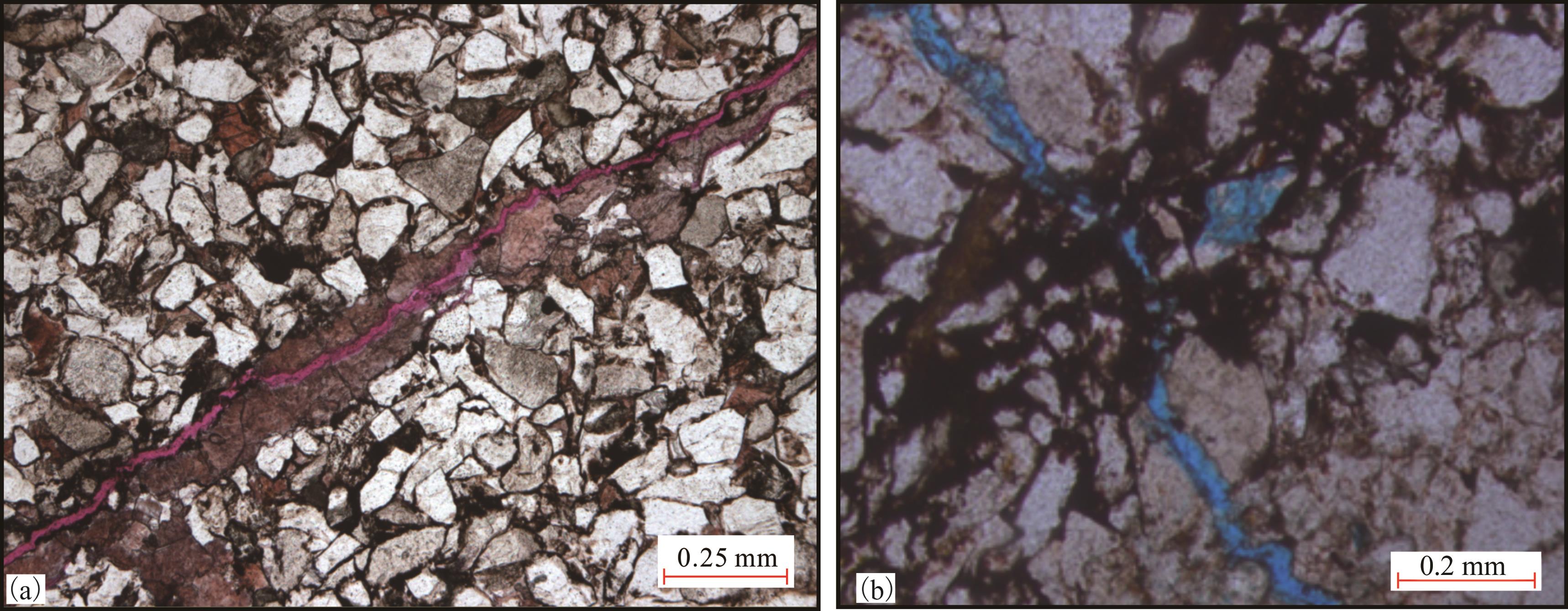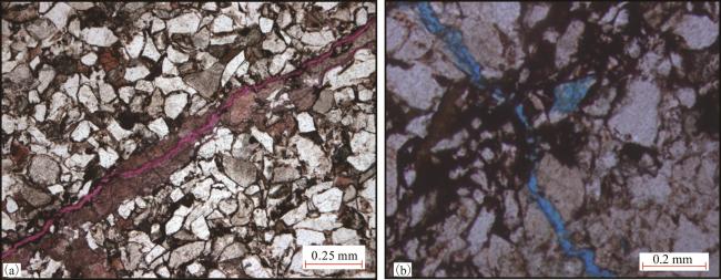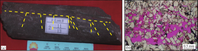 图13 塔里木盆地库车坳陷克拉苏构造带大北地区大北101井K1 bs牙刷状组合(伴生型的一种)裂缝及其周缘孔隙发育特征(a)大北101井,2 11/13块,牙刷状裂缝发育特征;(b)大北101井,2 11/13块,5 801.22 m,溶蚀缝发育,×50 Fig.13 Toothbrush combination (a kind of associated pattern) fractures and pore characteristic around these fractures in K1 bs of Well Dabei 101 of Dabei region, Kelasu tectonic belt, Kuqa Depression, Tarim Basin |