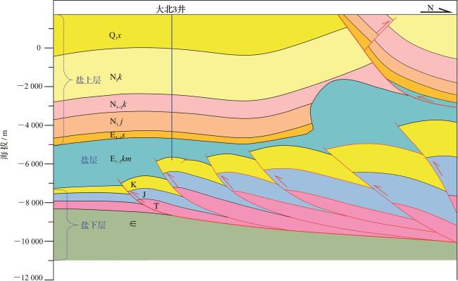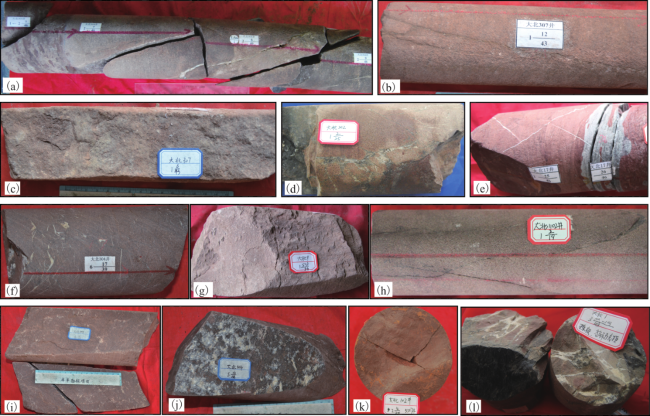 图4 塔里木盆地库车坳陷克拉苏构造带大北地区K1 bs岩心裂缝发育特征(a)雁列状组合裂缝,半充填张性缝,大北304井,6 876.04 m;(b)“Y”型组合裂缝,未充填,大北307井,7 212.86 m;(c)近直立未充填裂缝,大北307井,7 211.02 m;(d)“牙刷型”组合裂缝,半充填,大北202井,5 717.44 m;(e)错断型组合裂缝,大北17井,6 152.57 m;(f)方解石充填网状缝,大北304井,7 077.73 m;(g)裂缝面擦痕,大北9井,4 854.5 m;(h)“X”型组合裂缝,大北1102井,5 875.3 m;(i)大北304井,6 975.06 m,近直立未充填张性裂缝;(j)大北304井,7 028.12 m,高角度半充填张性裂缝;(k)“T”字型组合,大北102井,5 327.4 m;(l)摩擦光滑面与多条方解石充填网状裂缝,大北1井,5 675.3 m Fig.4 Pictures showing characteristics of tectonic fractures of K1 bs by core observation in Dabei region of Kuqa Depression, Tarim Basin |