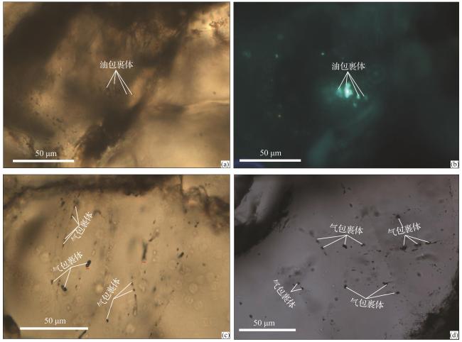 图2 西湖凹陷中北部储层典型油气流体包裹体照片(紫外线和透射光下)(a)D气田1井,4 216 m,透射光,沿切穿石英颗粒的微裂隙分布的轻质油气包裹体;(b)与(a)为同一视域,荧光;(c)D气田1井,4 212 m,透射光,沿切穿石英颗粒的微裂隙分布的气包裹体和盐水包裹体;(d)E气田1井,4 620 m,透射光,沿切穿石英颗粒的微裂隙分布的气包裹体和盐水包裹体 Fig.2 Photomicrographs of representative oil and gas inclusions in central-northern Xihu Sag (under ultraviolet light and transmitted light) |