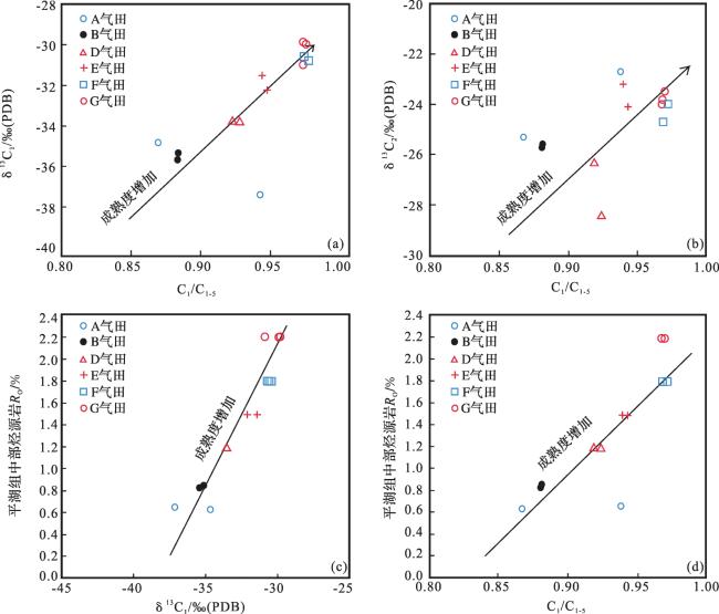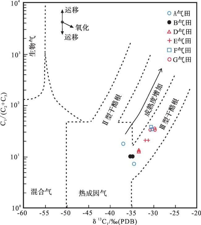 构造位置 | 井号 | 层位 | 天然气组分/% | C1/C1-5 | 稳定碳同位素/‰(PDB) | ||||||||||