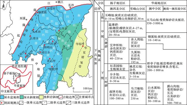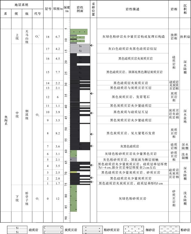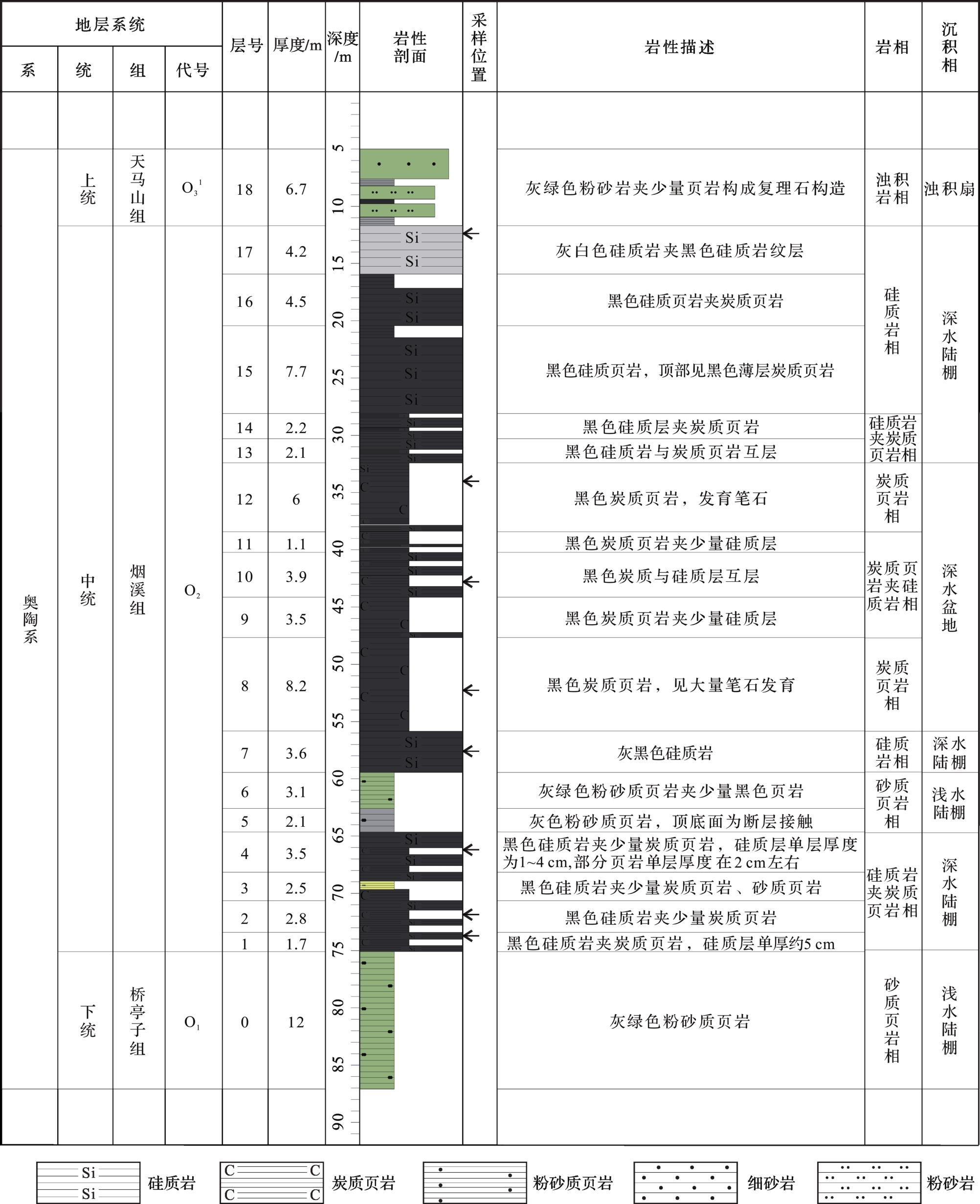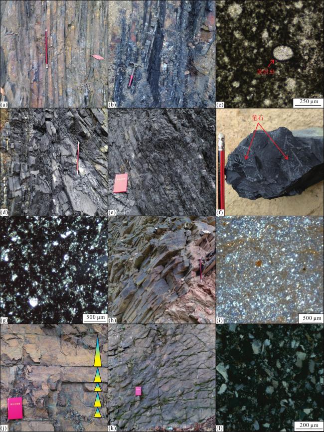 图2 湘中南地区中奥陶统烟溪组岩石野外照片及显微照片(a)硅质岩,棉花坪剖面;(b)硅质岩与炭质页岩互层,石牛乡剖面;(c)含放射虫硅质岩,显微照片,正交偏光,马杜桥剖面;(d)炭质页岩,破碎严重,烟溪镇剖面;(e)炭质页岩,局部揉皱严重,棉花坪剖面;(f)含笔石炭质页岩,马杜桥剖面;(g)炭质页岩,显微照片,正交偏光,棉花坪剖面;(h)粉砂质页岩,大桥村剖面;(i)粉砂质页岩显微照片,正交偏光,大桥村剖面;(j)泥质粉砂岩,浊积岩相,具复理石构造,马杜桥剖面;(k)槽模构造,浊积岩相,寺场坪剖面;(l)含泥质极细砂岩显微照片,浊积岩相,分选差—中等,次圆—次棱状,寺场坪剖面 Fig.2 Field photographs and micrographs of rocks of the Yanxi Formation of the Middle Ordovician in central-southern Hunan |