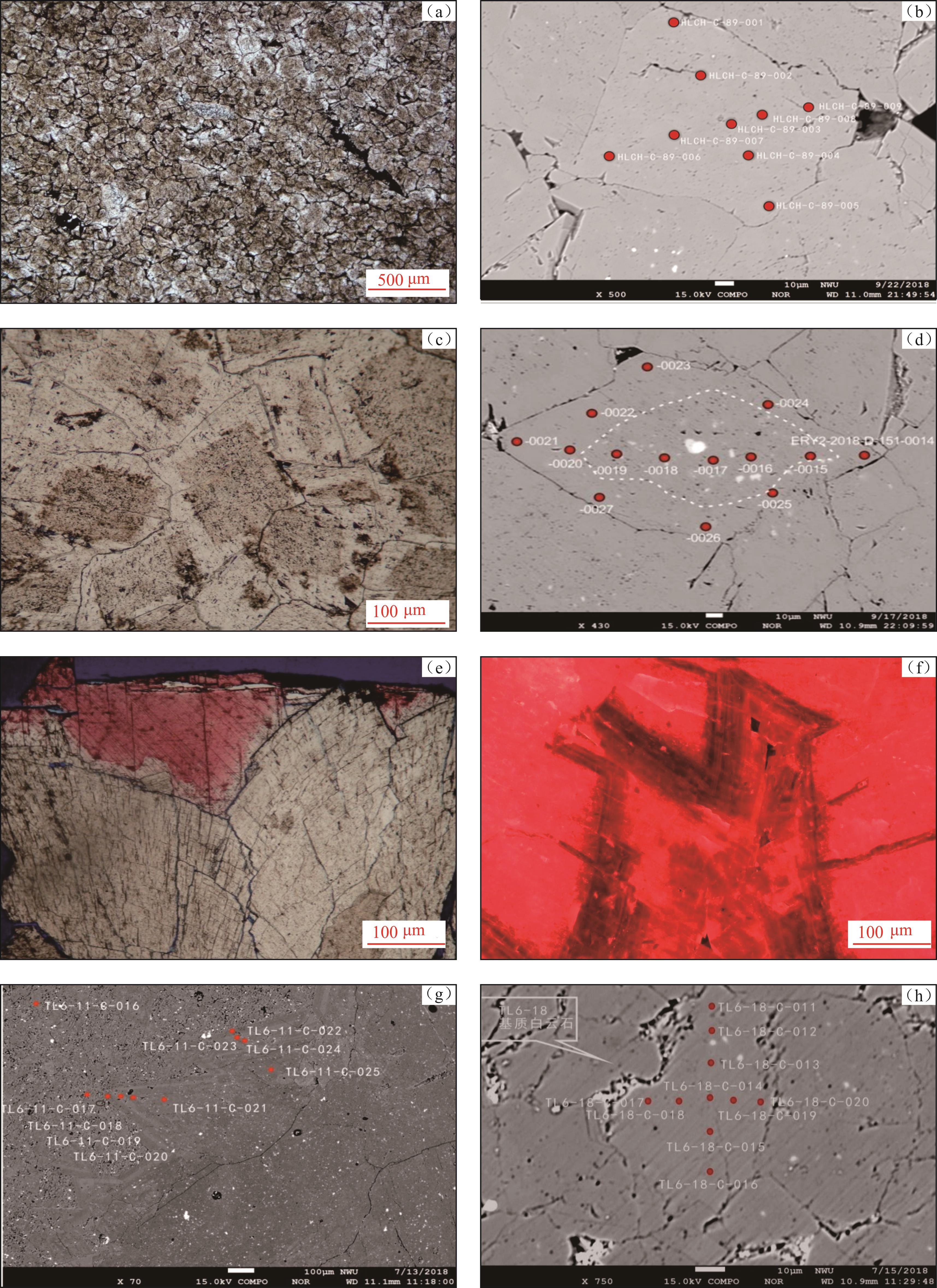图3 川东地区不同类型白云石镜下特征(a)镶嵌状白云石,回龙场;(b)电子探针微区电镜特征,回龙场;(c)“雾心亮边”白云石,二崖;(d)“雾心亮边”白云石电镜特征,二崖;(e)构造热液白云石,TL6井;(f)构造热液白云石阴极发光特征,TL6井;(g)构造热液白云石电镜特征,TL6井;(h)镶嵌状白云石电镜特征,TL6井 Fig.3 Microscopic characteristics of different types of dolomite in eastern Sichuan Basin |