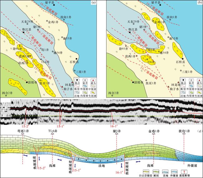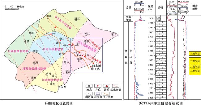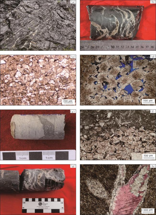 图2 川东地区茅口组白云岩露头、岩心及显微镜下特征(a)茅口组白云岩特征,回龙场剖面;(b)茅口组白云岩岩心特征,TL6井;(c)镶嵌式白云岩,回龙场剖面;(d)“雾心亮边”白云岩,晶间孔发育,二崖剖面;(e)茅口组上部白云化作用结束处,白云岩与含生屑灰岩之间为缝合线接触,二崖剖面;(f)茅口组白云化作用结束处,白云岩与含生屑灰岩为缝合线接触,二崖剖面;(g)茅口组白云岩热液破裂缝洞特征,半充填,TL6井;(h)茅口组白云岩热液白云石脉体,半充填,TL6井 Fig.2 Outcrop, core and microscopic characteristics of dolomite of Maokou Formation in eastern Sichuan Basin |