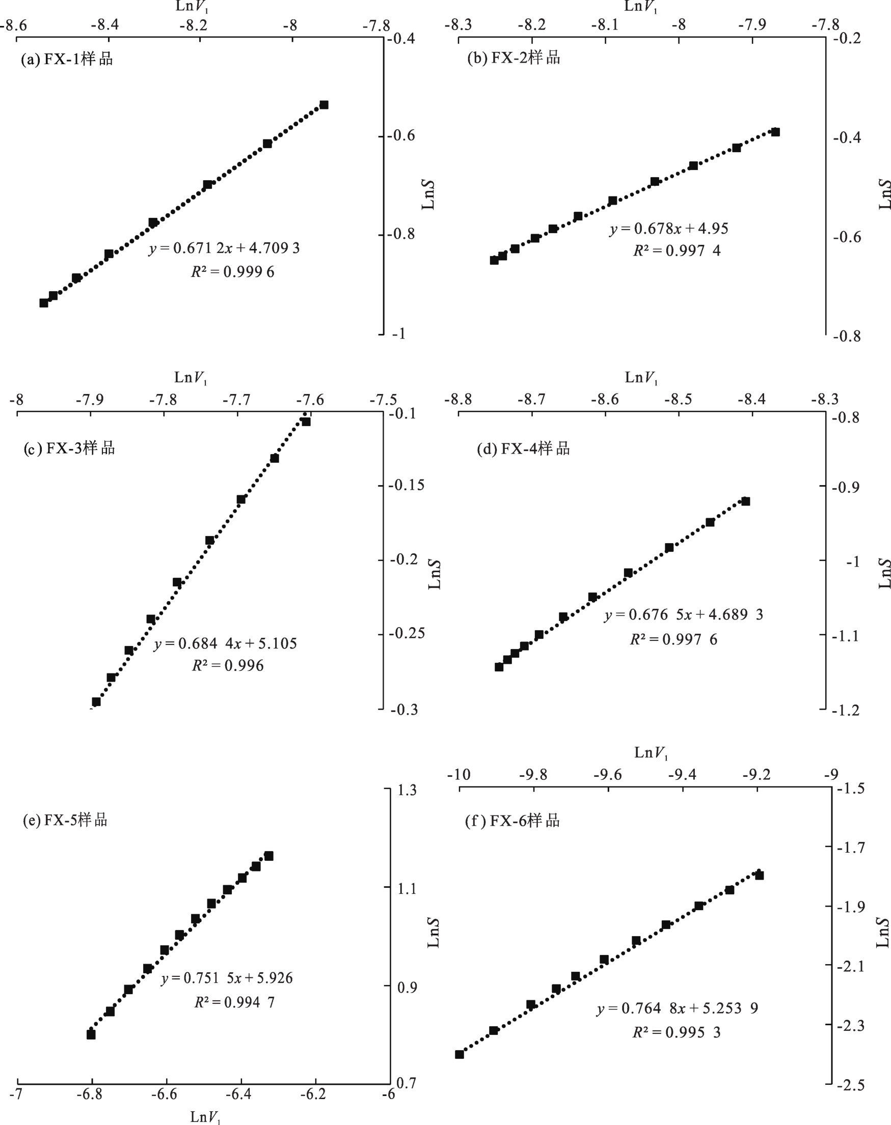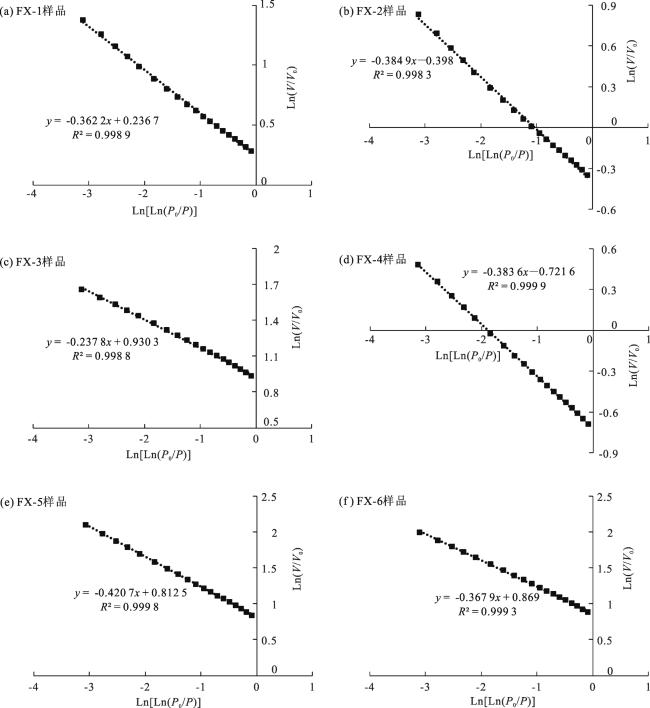 图2中泥页岩样品微孔分形维数计算过程中,V—S模型拟合优度高,6个样品的拟合相关系数