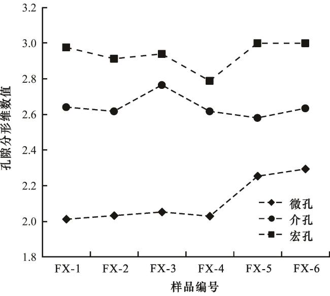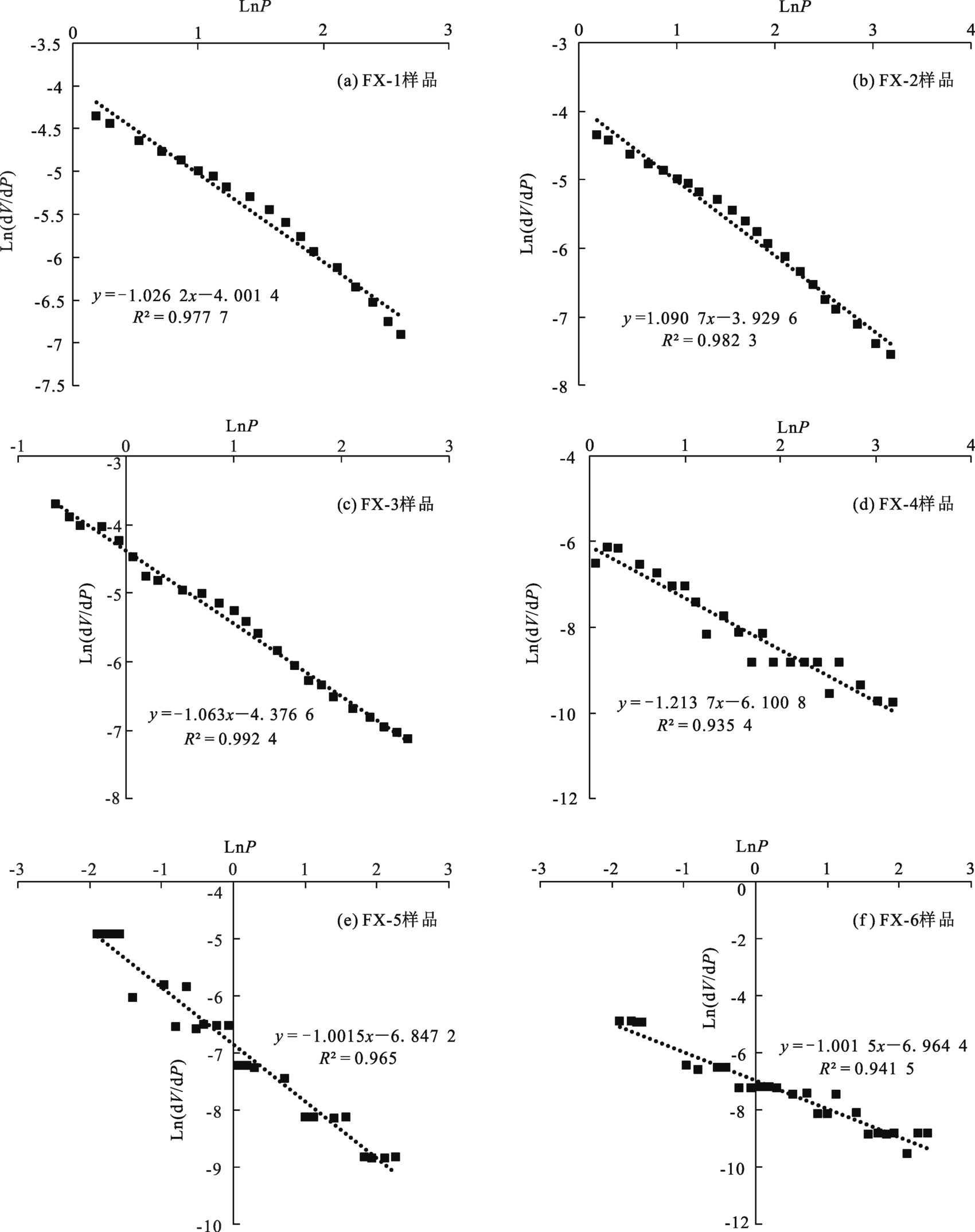 表1)。页岩中孔隙结构的分形维数介于2~3之间,而本文研究中