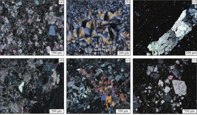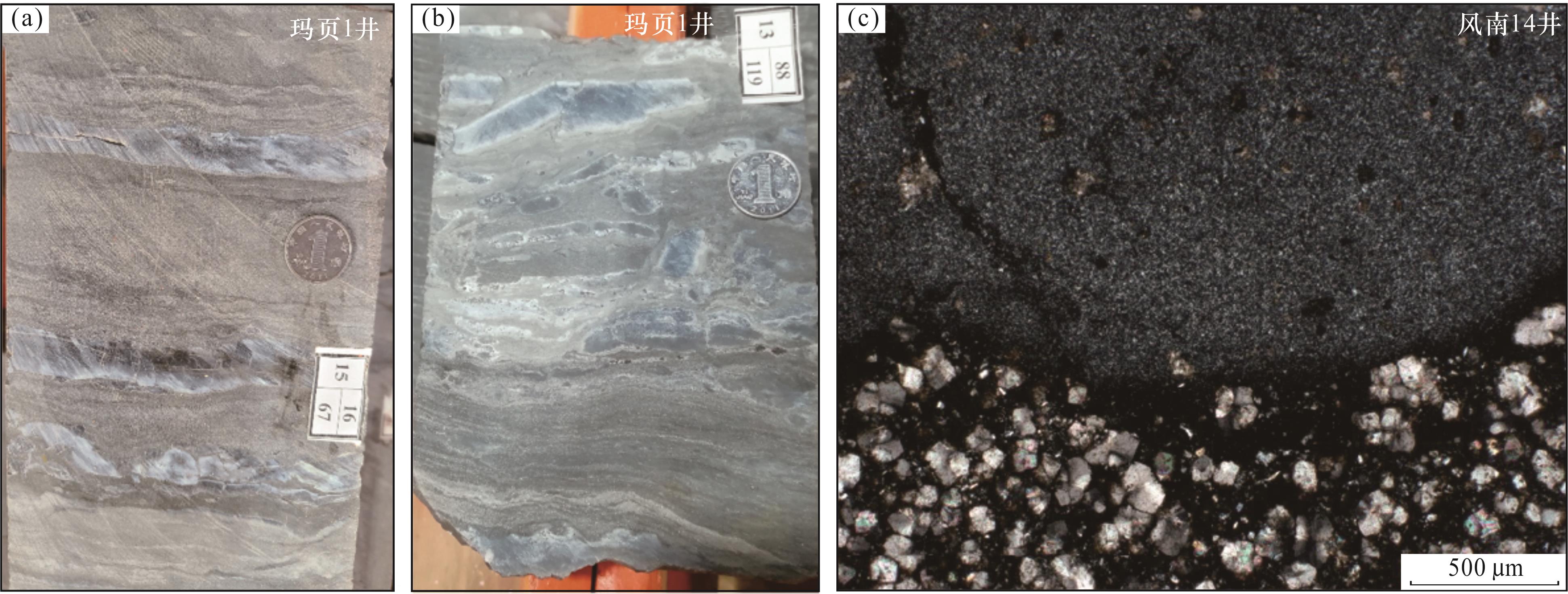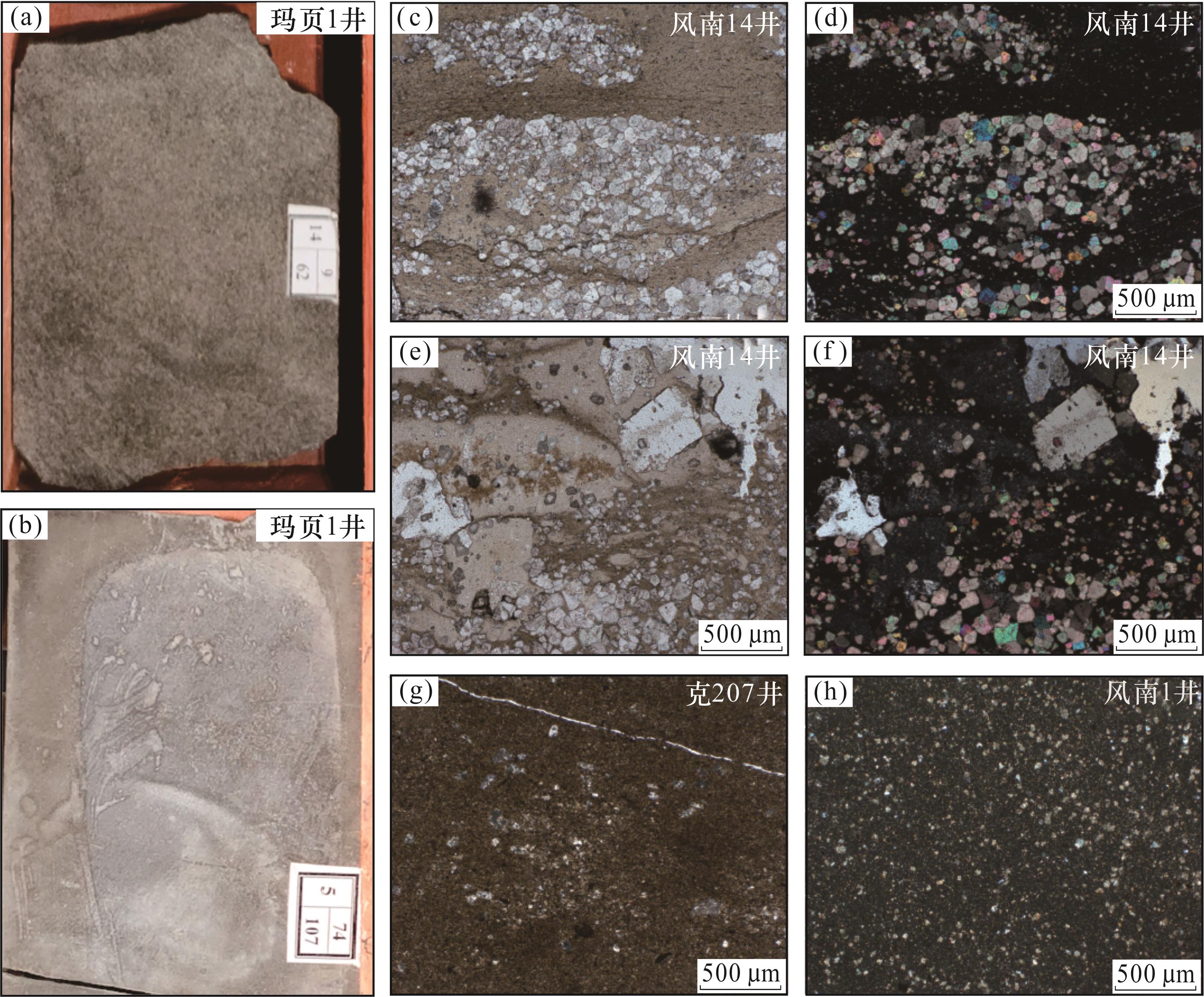 图6 玛湖凹陷下二叠统风城组白云质岩类特征(a)、(b)白云质岩类的宏观岩心照片,玛页1井;(c)风南14井,P1 f 3,4 171.87 m,泥质白云岩,单偏光;(d)风南14井,P1 f 3,4 171.87 m,泥质白云岩,正交偏光;(e)风南14井,P1 f 3,4 170.1 m,硅化白云质泥岩,单偏光;(f)风南14井,P1 f 3,4 170.1 m,硅化白云质泥岩,正交偏光;(g)克207井,P1 f 2,4 753.20 m,白云质泥岩,单偏光;(h)风南1井,P1 f,4 096.44 m,白云质泥岩,正交偏光 Fig.6 Dolomitic rocks of Fengcheng Formation of Lower Permian in Mahu Sag |