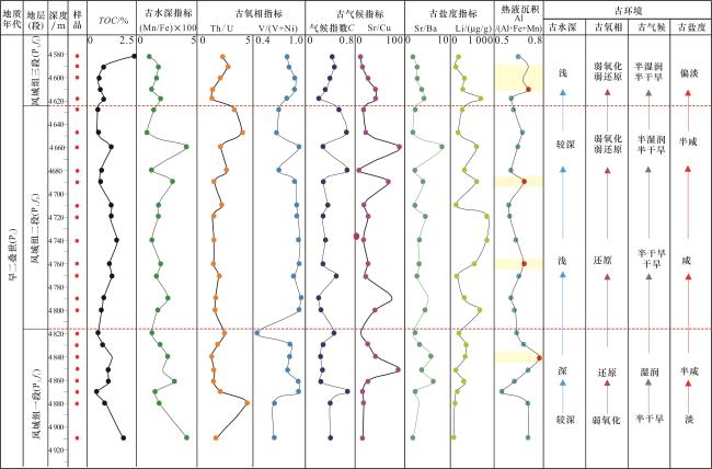 层位 | 参数 | 古水深 | 古氧化还原环境 | 古气候 | 古盐度 | ||||