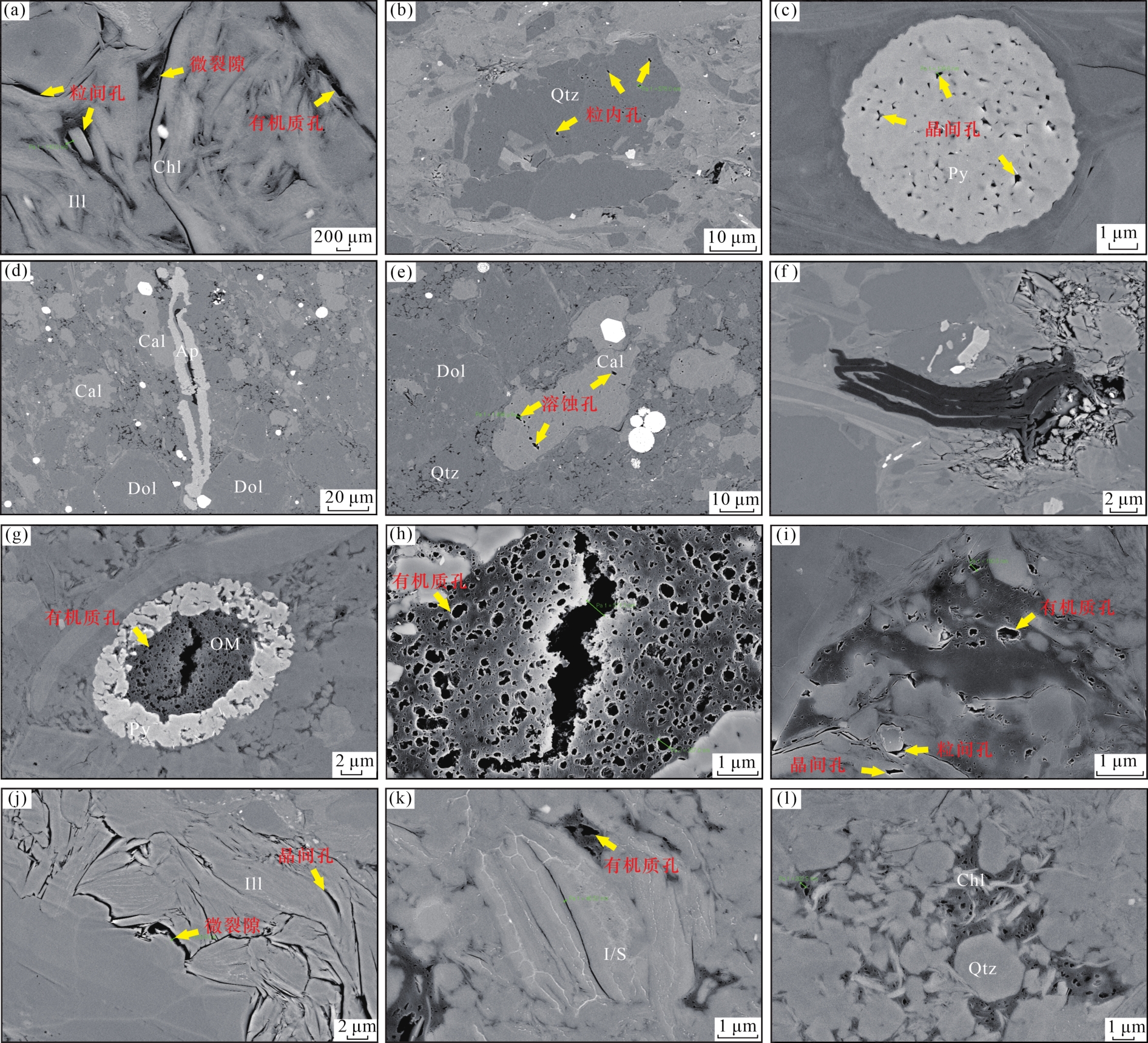 图2 B1井龙马溪组页岩样品储集空间发育特征(a)片状伊利石、绿泥石集合体与发育孔隙的有机质相间分布,组分间隙发育(20 000×);(b)长柱状石英发育少量粒内孔(1 400×);(c)草莓状黄铁矿发育晶间孔(8 500×);(d)长条状磷灰石、微粒状方解石等相间分布,发育少量溶蚀孔(600×);(e)微粒状方解石、白云石发育溶蚀孔,微晶石英(硅质)、黏土矿物、有机质等相间分布(1 000×);(f)碎片状有机质发育少量孔缝(3 000×);(g)有机质充填于圆环状黄铁矿中,孔缝发育(4 000×);(h)填隙状有机质孔隙极为发育(12 040×);(i)填隙状有机质发育孔径不一的孔隙(14 000×);(j)片状伊利石集合体发育层间缝、微裂隙(14 000×);(k)伊/蒙混层集合体发育层间缝(12 000×);(l)微晶石英、片状绿泥石集合体、发育孔隙的有机质相间分布(6 500×);图中矿物标记:Qtz石英;Cal方解石;Dol白云石;Chl绿泥石;Py黄铁矿; Om有机质;Ap磷灰石;Ill伊利石;I/S伊/蒙混层 Fig.2 Development characteristics of reservoir space of Longmaxi Formation shale samples in Well B1 |