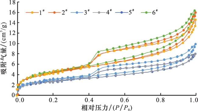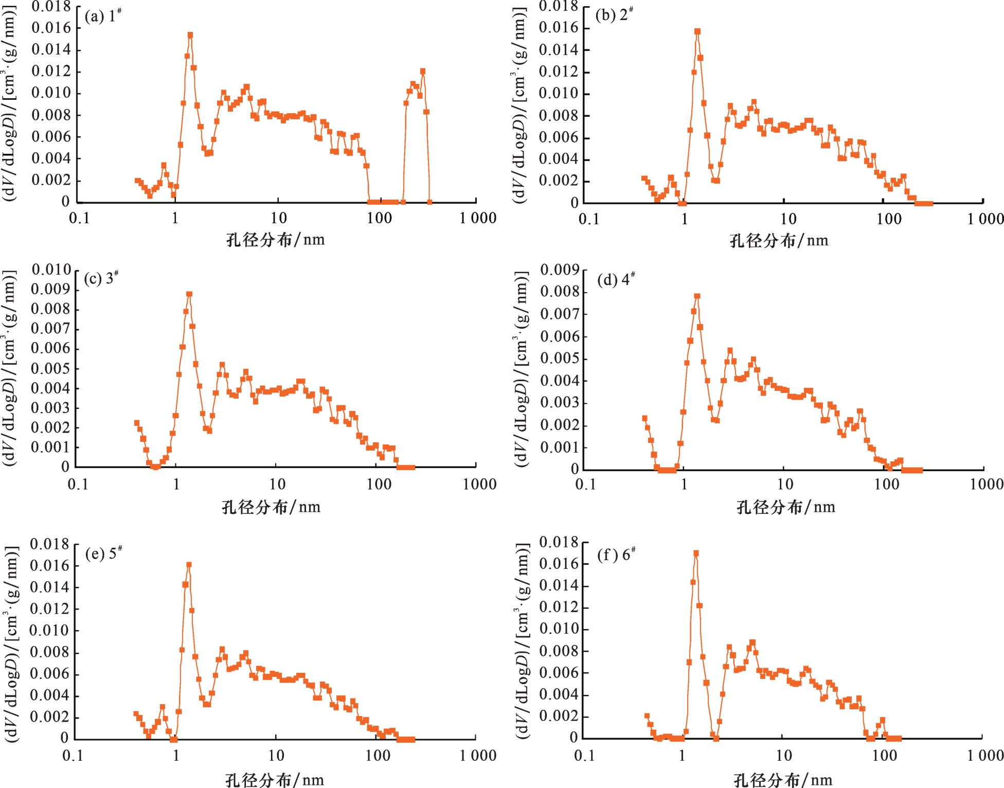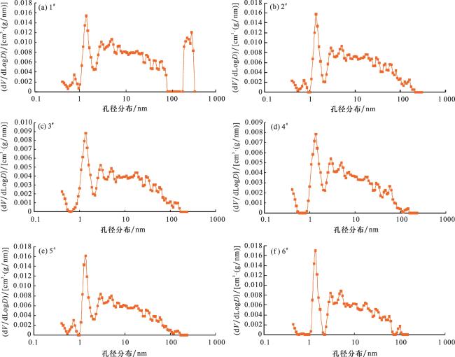 | 样品 编号 | 平均孔隙 直径/nm | 总比表面积 /(m²/g) | 总比孔容 /(cm³/g) | 微孔(<2 nm) | 介孔(2~50 nm) | 大孔(50~300 nm) | |||