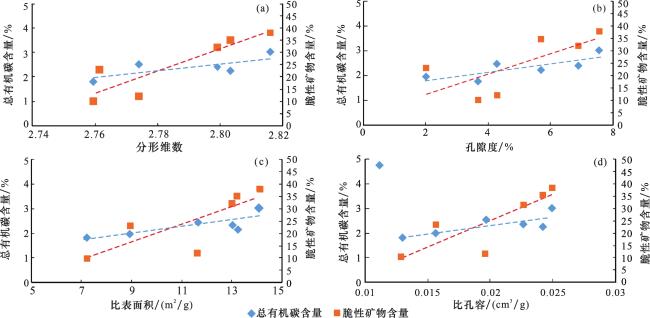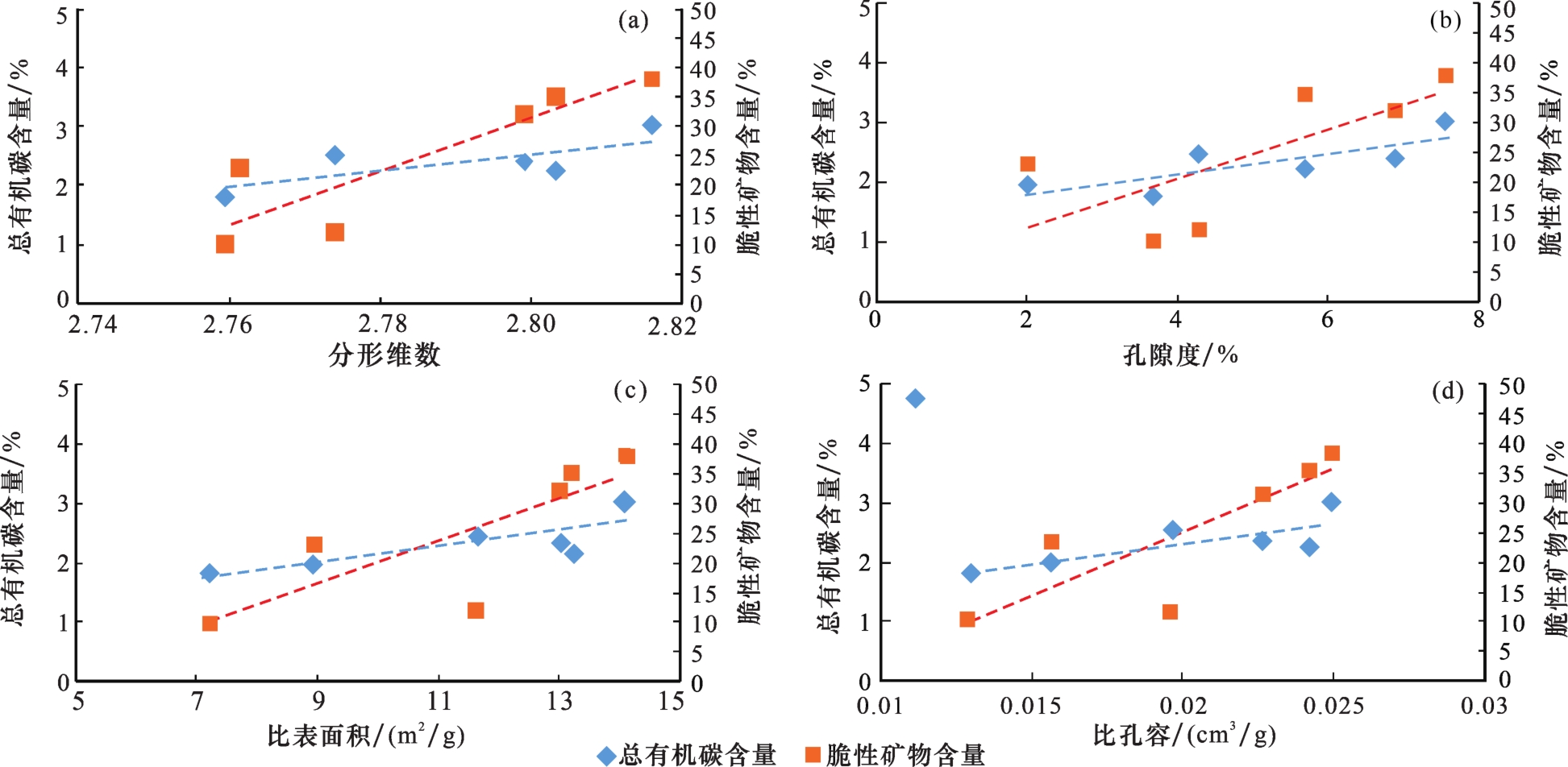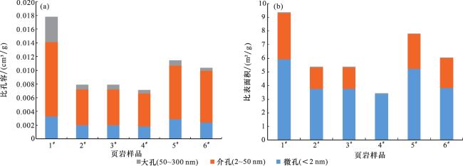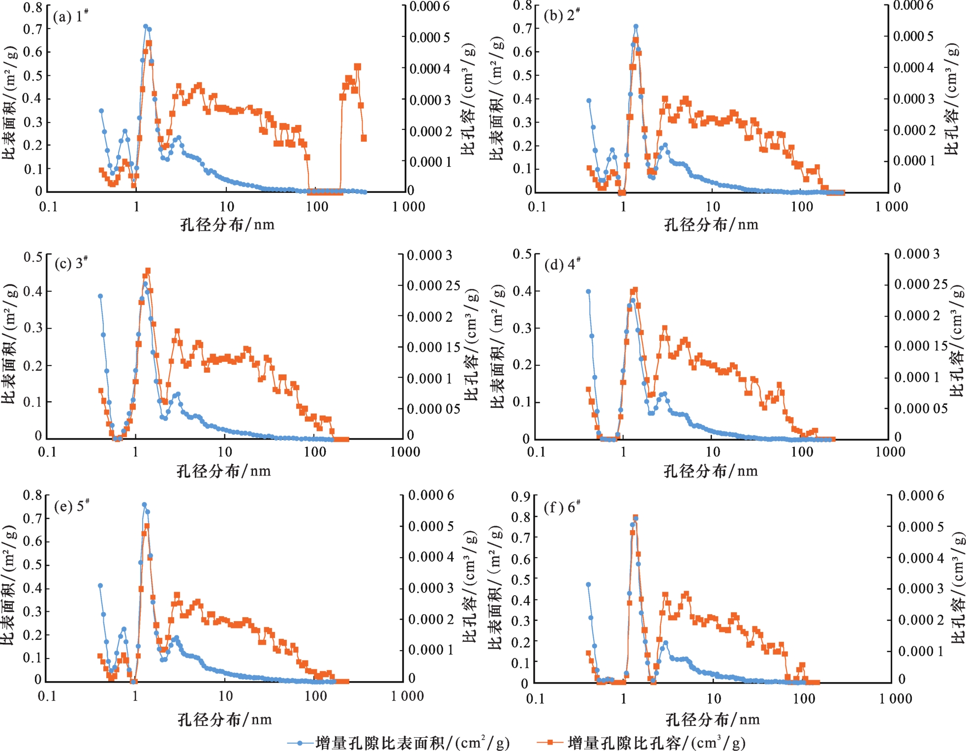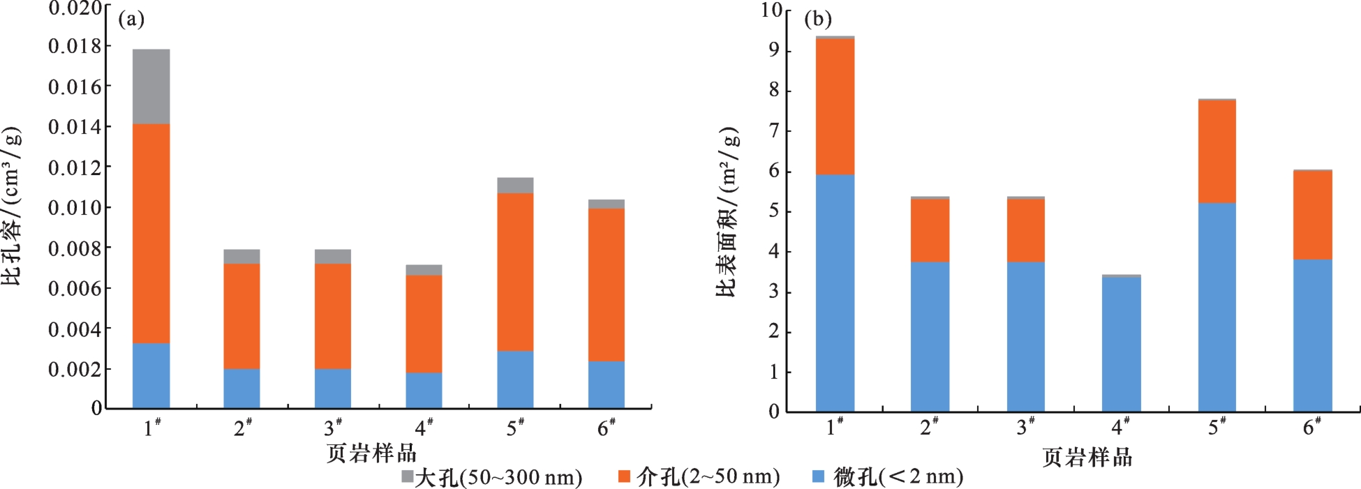 图5 B1井龙马溪组页岩样品孔隙比表面积、比孔容分布情况Fig.5 Distribution of different pore specific surface areas and specific pore volumes of Longmaxi Formation shale samples in Well B1 |