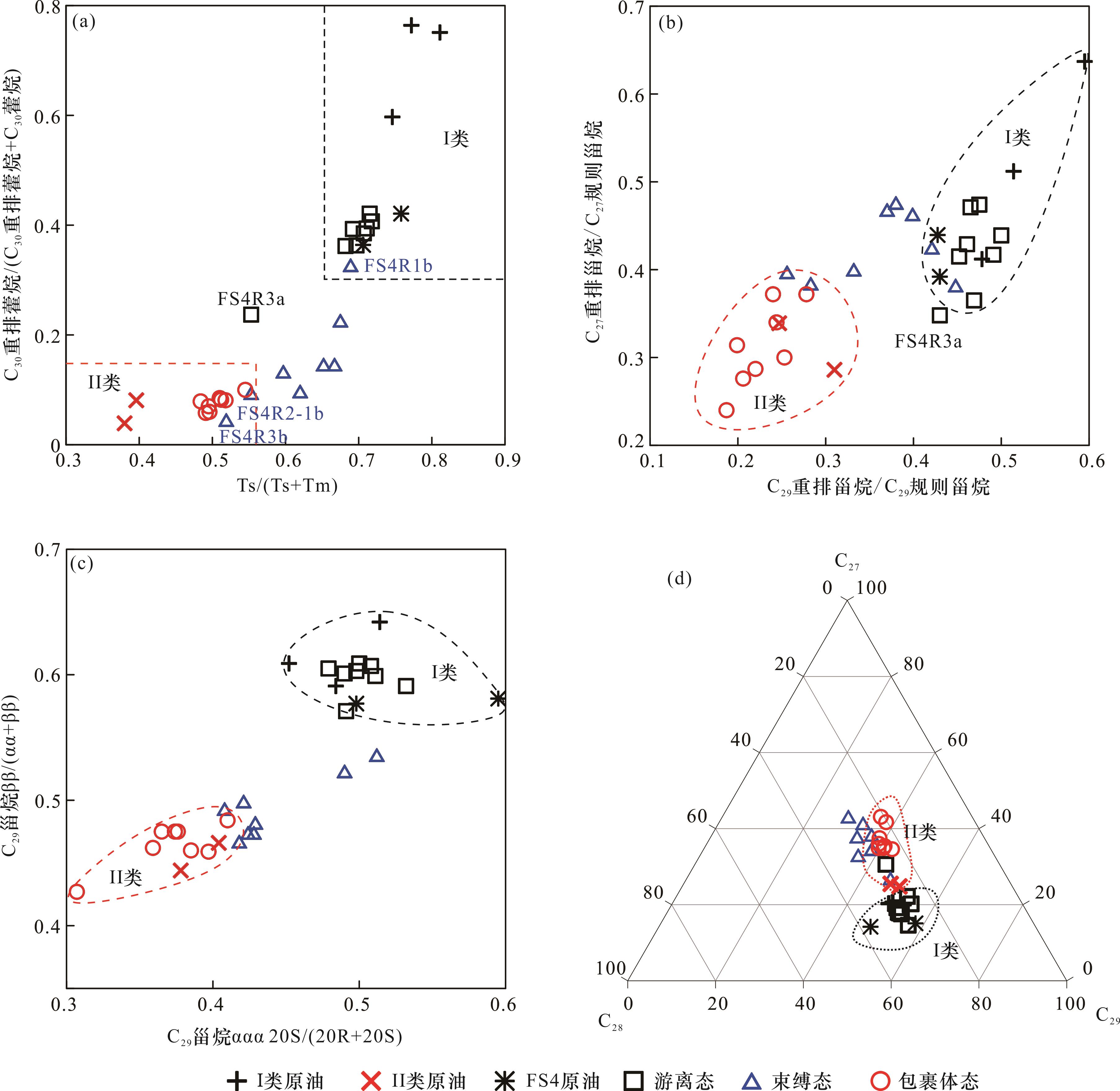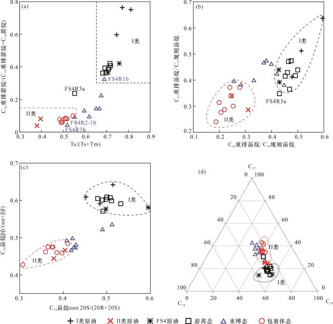 图4 原油和含油砂岩各组分甾烷、萜烷分子指标交会图Fig.4 Crossplots of steranes and terpanes parameters for oil components from crude oil and oil-containing sandstones |