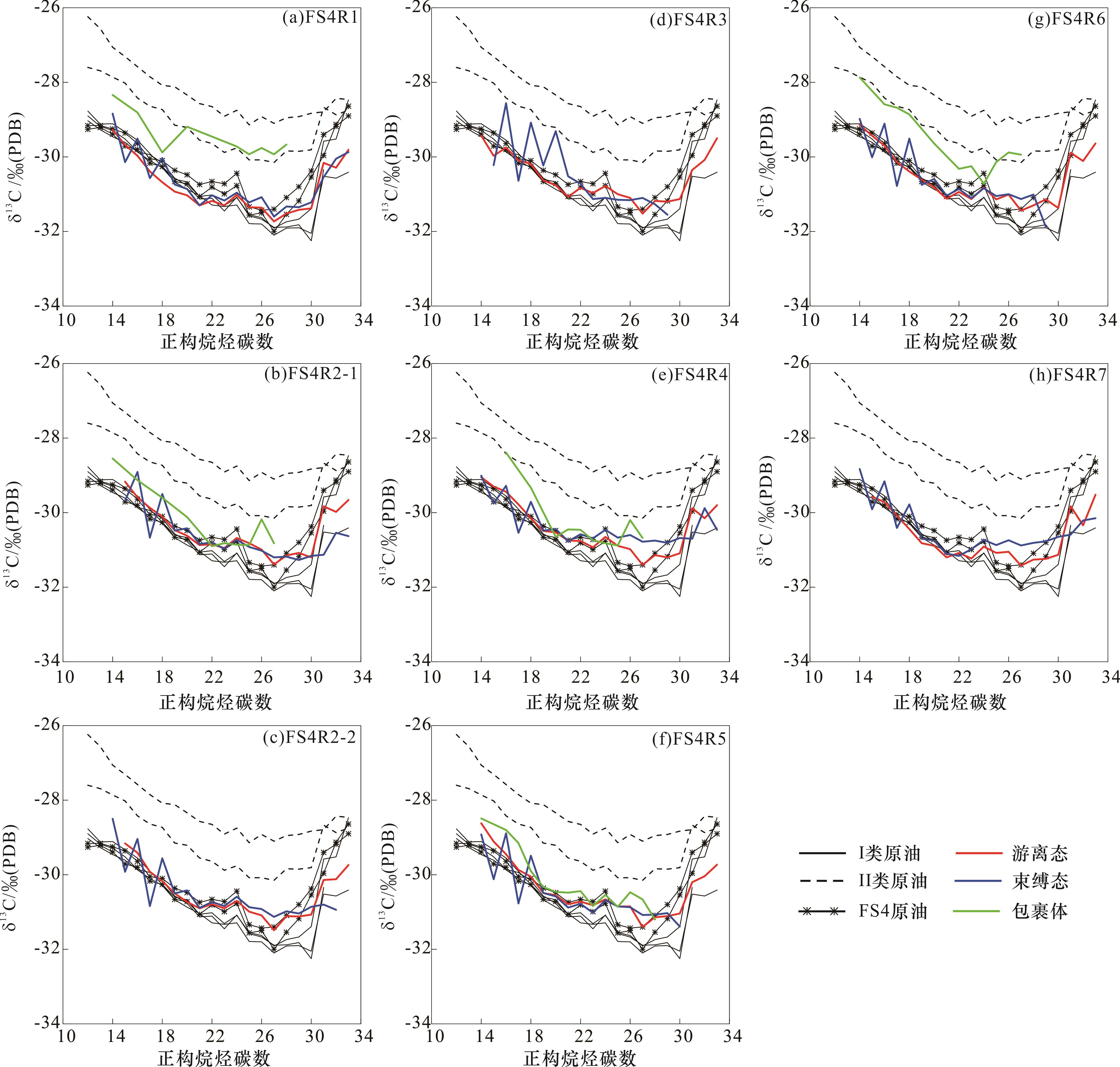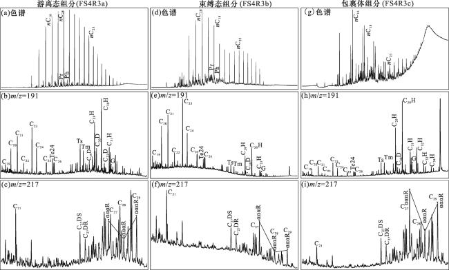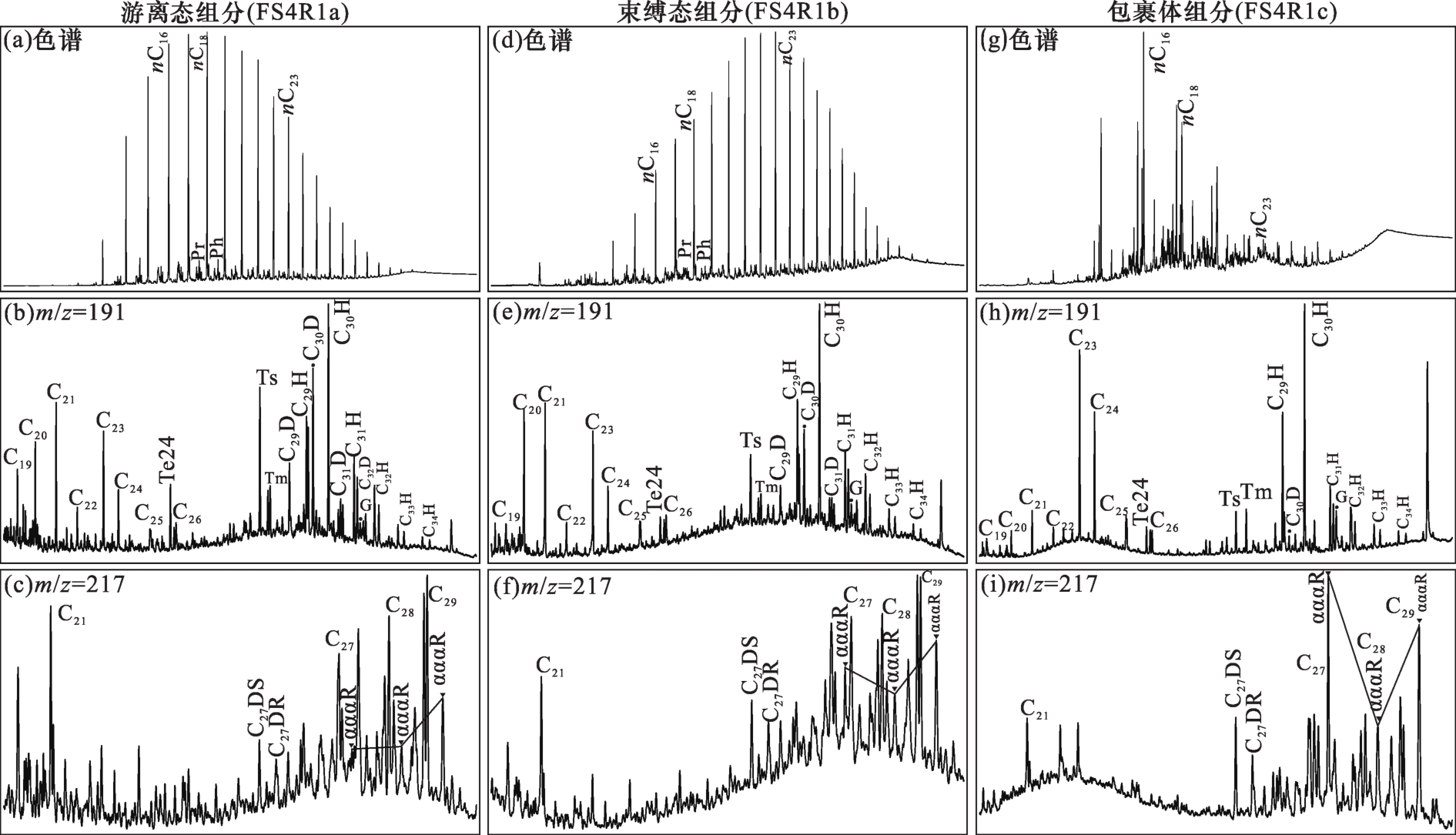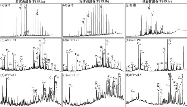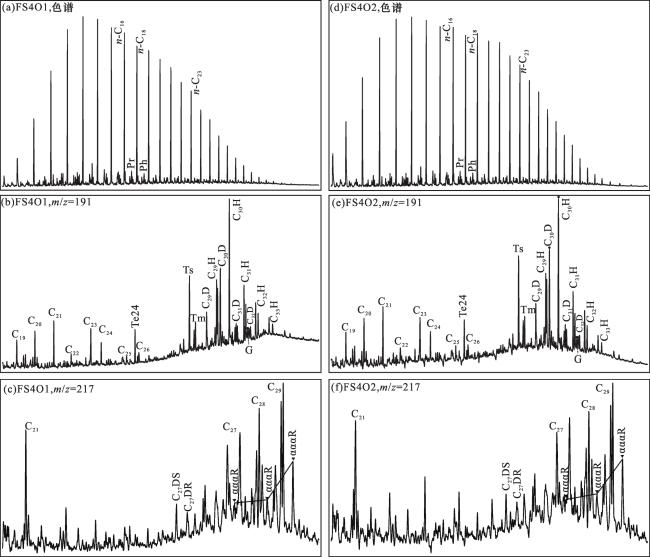 图6 FS4R1含油砂岩样品原油色谱、m/z=191和m/z=217质量色谱Fig.6 Chromatograms, m/z=191, m/z=217 mass chromatograms of crude oil from FS4R1 oil-containing sandstone |