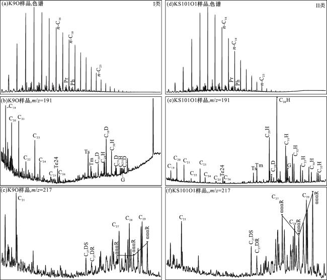 图3 柯克亚凝析油气田K9O和KS101O1原油样品色谱、m/z=191和m/z=217质量色谱在(b)、(e)中,C19-C26:三环萜烷;Te24:C24四环萜烷;C29-32D:C29-32重排藿烷;G:伽马蜡烷;在(c)、(f)中,C27DS:C27重排甾烷20S;C27DR:C27重排甾烷20R Fig.3 Chromatograms, m/z=191 and m/z=217 mass chromatograms of crude oil samples K9O and KS101O1 from Kekeya condense field |