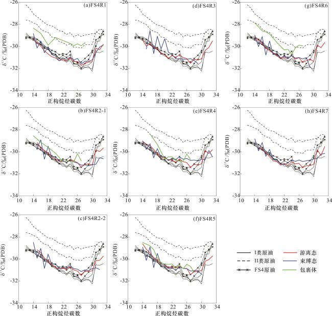 表2 原油和游离态(a)、束缚态(b)、包裹体(c)组分分子指标Table 2 Molecular indices of crude oils and free oils(a), adsorbed oils(b) and inclusion oils(c) |