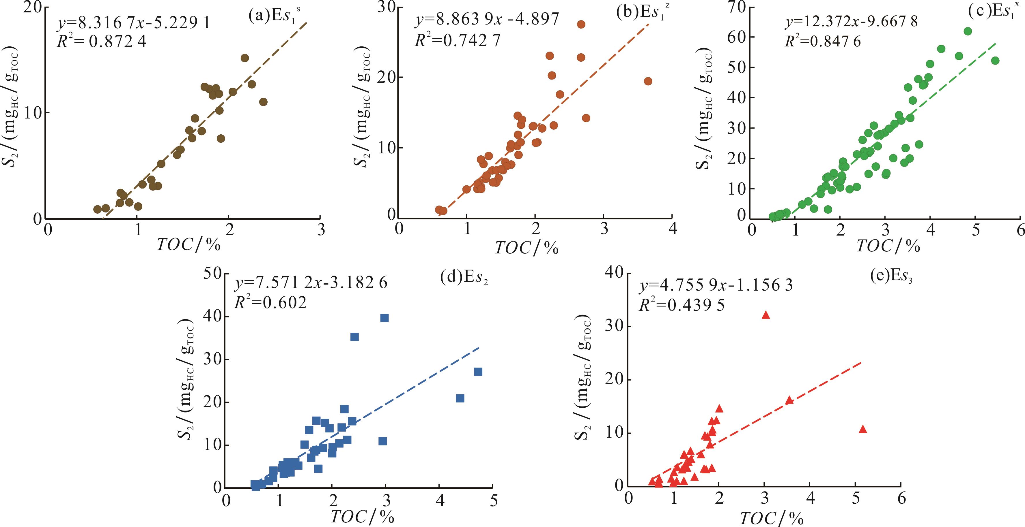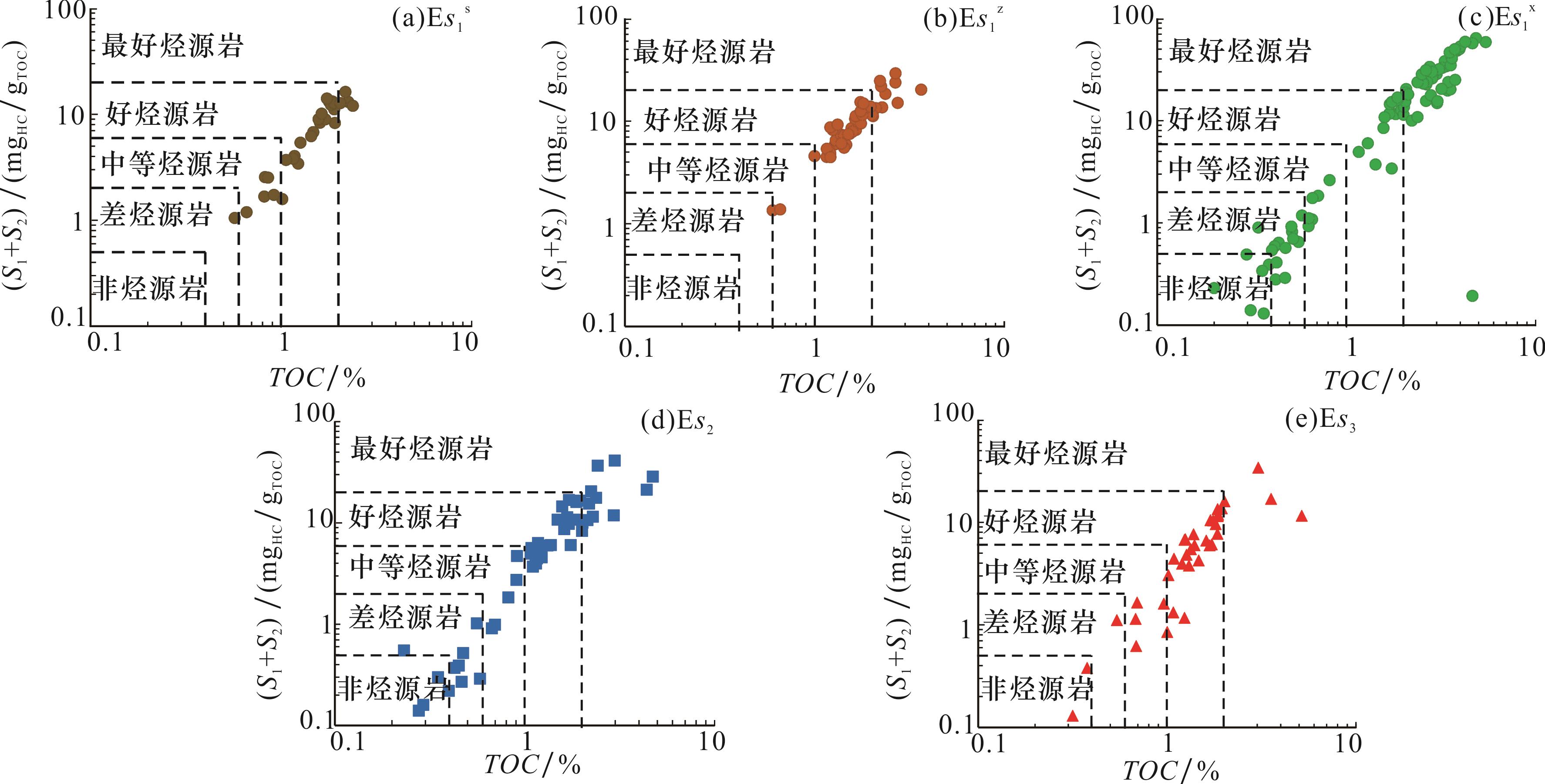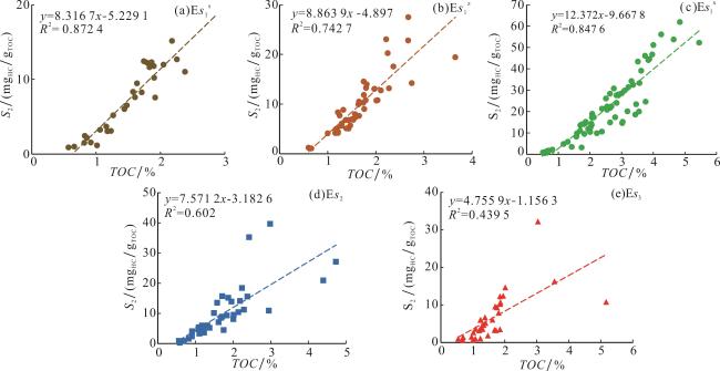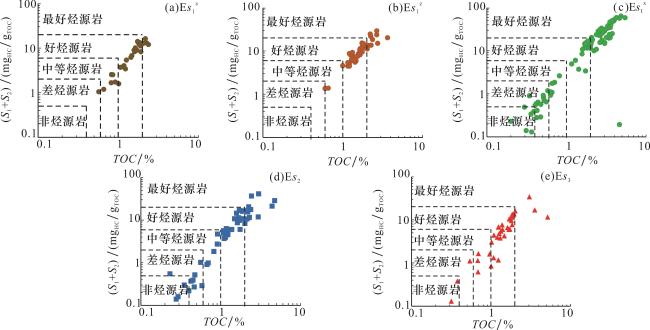 图4 歧口凹陷沙河街组烃源岩S 1+S 2与TOC关系(坐标系为对数坐标)Fig.4 Relationship between S 1+S 2 and TOC of source rocks in Shahejie Formation, Qikou Sag(coordinate system is logarithmic coordinate) |