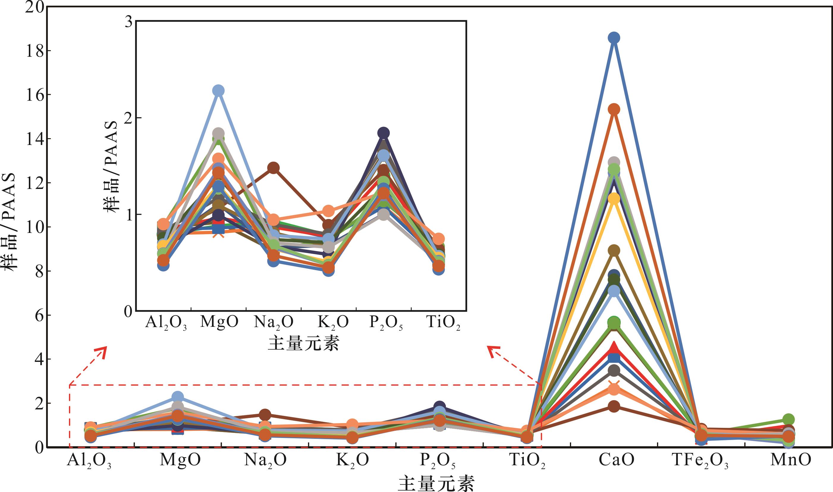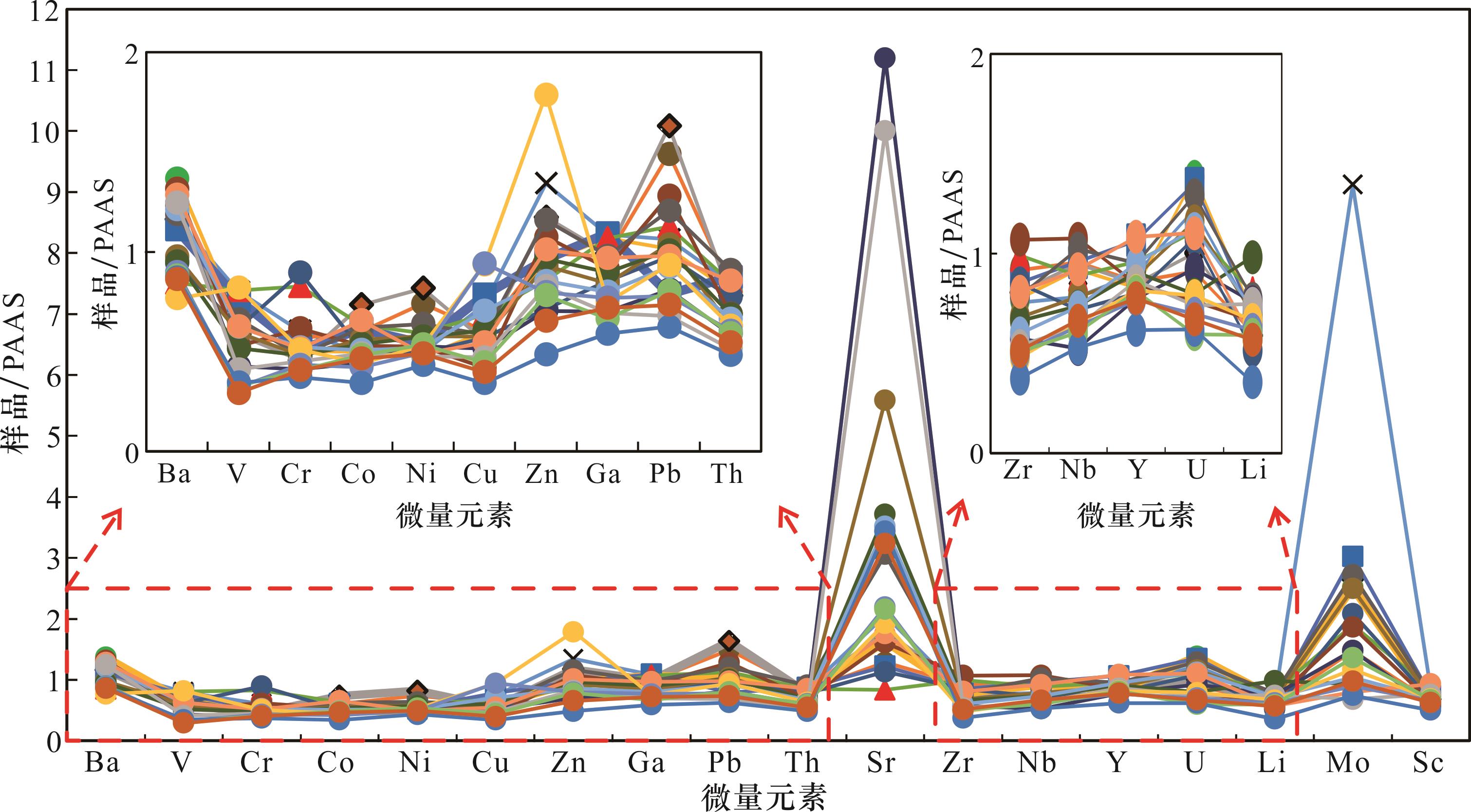 | 编号 | 深度/m | 层位 | δ13C/‰(VPDB) | δ18O/‰(VPDB) | Z值 | Sr/Ba | B/Ga | Sp |