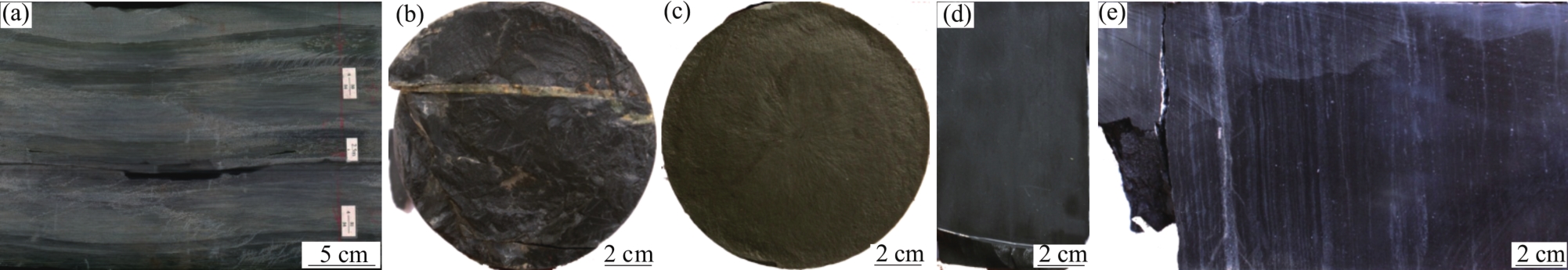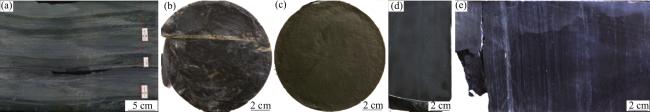 图6 上奥陶统泥岩类“黑被子”盖层岩性特征(a)深灰色—灰色泥岩,含少量的钙质,英东2井,3 996.1 m,O3 q,岩心;(b)深灰色泥岩,发育高角度裂缝,内部被方解石全充填,塔东2井,4 088.46 m,O3 q,岩心;(c)灰色—褐灰色泥岩、含粉砂质泥岩,层面可见黑色笔石化石,塔中28井,4 880.15 m,O3 q,岩心;(d)深灰色钙质泥岩,塔中29井,5 381.86 m,O3 q,岩心;(e)深灰色钙质泥岩,含薄层灰色生屑灰岩,发育水平层理,满加1井,6 822.68 m,O3 q,岩心 Fig.6 The lithologic characteristics of mudstone “black quilt” cap rock in Upper Ordovician |