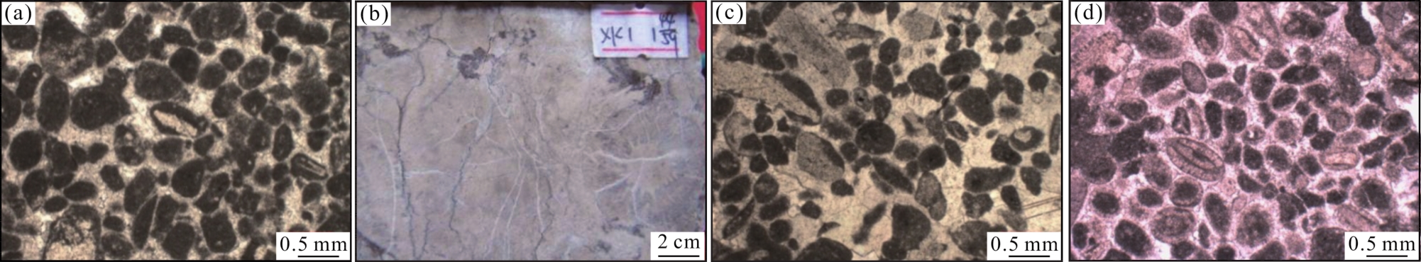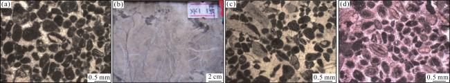 图10 奥陶系致密碳酸盐岩高阻层岩性特征(a)亮晶砂屑灰岩,颗粒呈圆—次圆状,见藻砂屑、鲕粒,颗粒以漂浮状态镶嵌在胶结物之上,HA12-1井,O2 y,6 690.52 m,普通薄片,单偏光;(b)浅灰色含瓶筐石砂屑灰岩,裂缝内全充填泥质,新垦7井,O2 y,6 930.6 m,岩心;(c)亮晶颗粒灰岩,颗粒为棘屑、砂屑及砾屑,呈次棱角状—圆状,新垦7井,O2 y,6 921.95 m,普通薄片,单偏光;(d)亮晶鲕粒灰岩,主要为表鲕,英买201井,O2 y,5 874.3 m,普通薄片,单偏光 Fig.10 The lithologic feature of the high-resistivity layers of Ordovician carbonate rock |