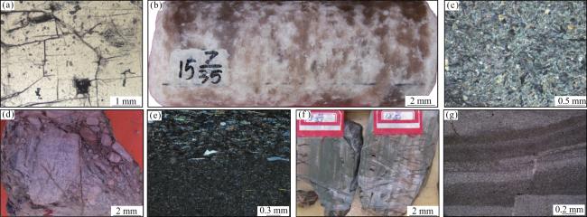 图3 中寒武统“白被子”盖层岩性特征(a)盐岩,晶粒结构,晶体间见晶间缝,方1井,4 082 m,∈2,普通薄片,单偏光;(b)褐红色盐岩,晶粒结构,巴探5井,5 296.3~5 296.51 m,∈2,岩心;(c)膏岩,石膏晶体呈发丝状,为放射状晶簇集合体形态,方1井,4 258 m,∈2,普通薄片,正交偏光;(d)膏质角砾岩,角砾成分主要为膏岩,角砾呈不规则状、大小不等,砾间主要为泥质充填,中深5井,6 220.42 m,∈2,岩心;(e)下部为膏质白云岩,上部为白云质膏岩,岩性分界面明显,石膏层为板条状、不规则状,定向排列,中深5井,6 562 m,∈2,普通薄片,正交偏光;(f)深灰色泥岩与褐色白云岩不等厚互层,泥质以条纹状、脉状分布,牙哈5井,5 810.15~5 810.27 m,∈2,岩心;(g)泥质白云岩,泥质呈顺层状分布,白云石为泥晶结构,牙哈5井,5 800.27 m,∈2,普通薄片,正交偏光 Fig.3 The lithologic feature of “white quilt” cap rock in Middle Cambrian |