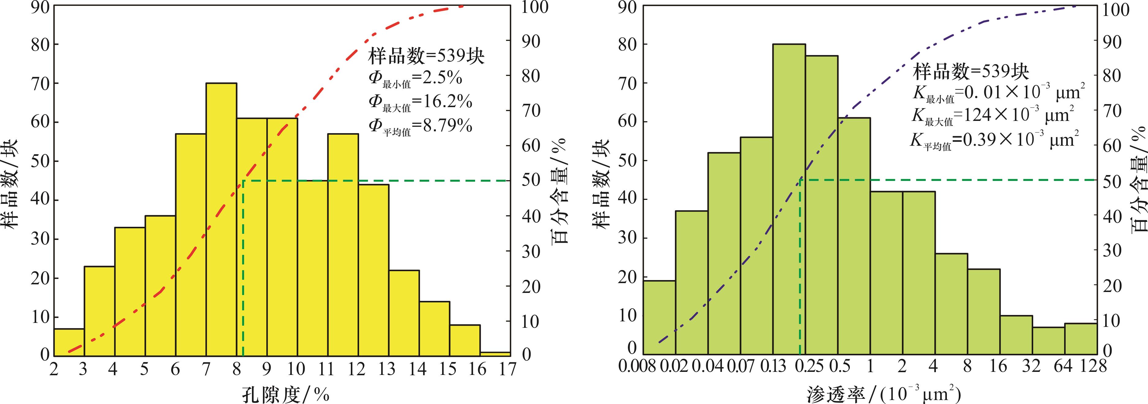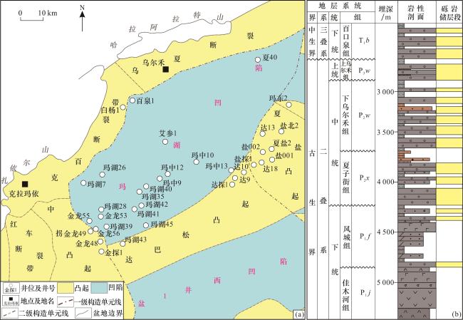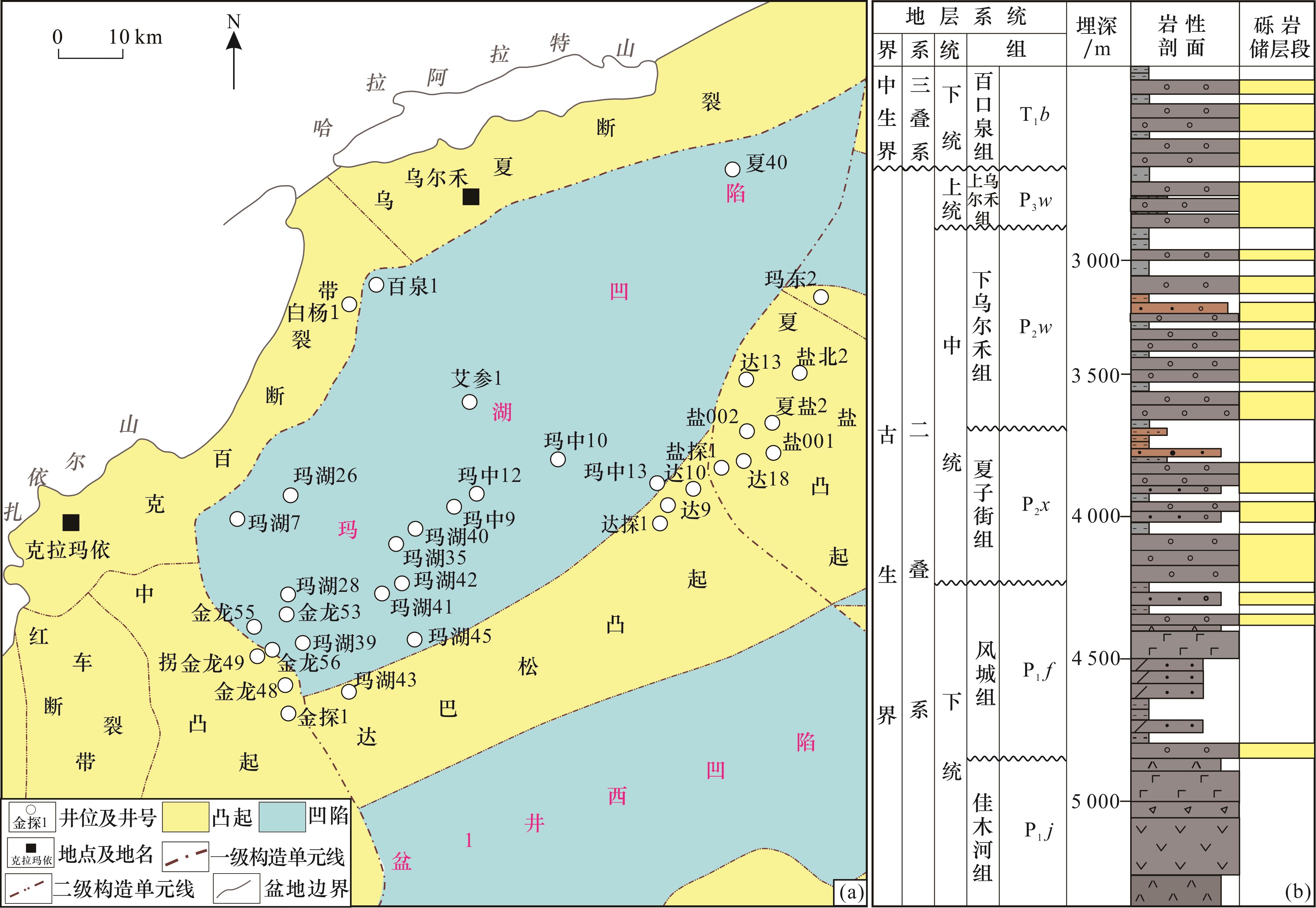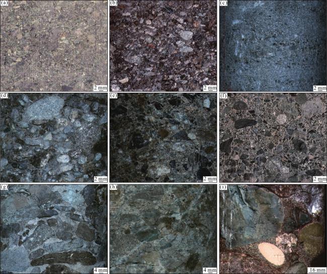 图2 玛湖地区深层致密砾岩储层特征(a)灰色荧光细砾岩(夏40井,4 886.22~4 886.32 m,P1 f);(b)褐灰色油迹细砾岩(达18井,4 528.43~4 528.53 m,T1 b);(c)灰色油斑细砾岩(玛湖40井,4 536.68~4 536.78 m,P3 w);(d)灰色油斑中细砾岩(玛中12井,4 646.96~4 647.06 m,P3 w);(e)灰色油迹中细砾岩(玛湖43井,5 184.55~5 184.65 m,P3 w);(f)灰色荧光中细砾岩(金探1井,4 535.43~4 535.53 m,P3 w);(g)灰色油斑中砾岩(玛中12井,4 663.92~4 664.02 m,P3 w);(h)灰色油斑中砾岩(金龙55井,4 713.75~4 713.85 m,P2 x);(i)灰褐色粗砾岩(玛湖45井,4 884.68~4 884.78 m,T1 b) Fig.2 Characteristics of deep tight conglomerate reservoir in Mahu area |