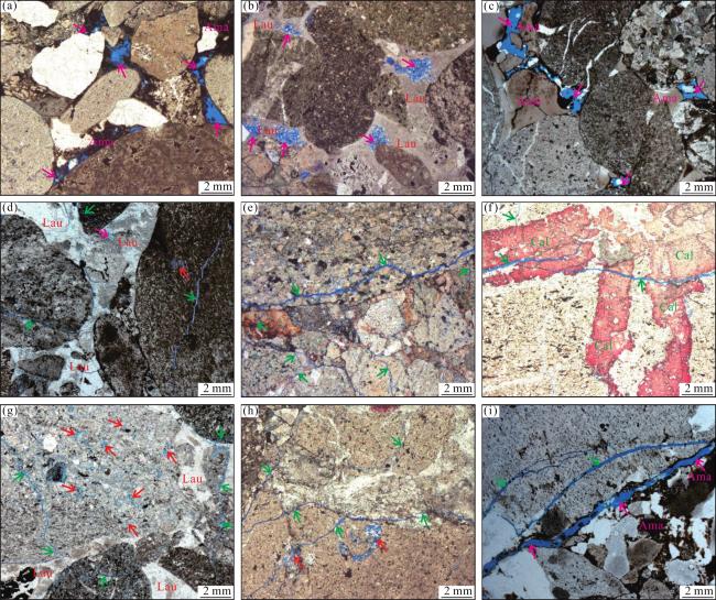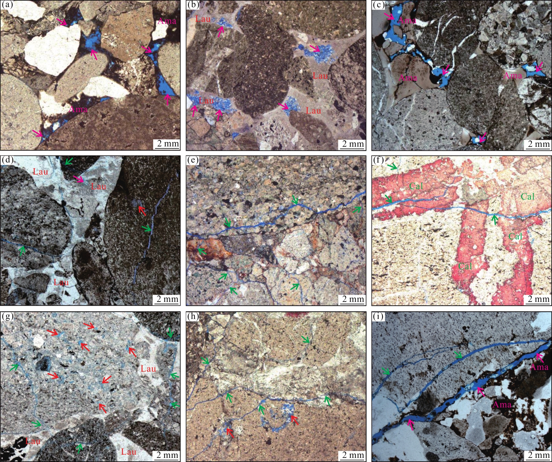 图4 玛湖地区深层致密砾岩压溶作用及裂缝发育特征(铸体薄片)(a)颗粒线接触和凹凸接触,泥质杂基粒间溶孔(达18井,4 515.00 m,T1 b);(b)颗粒线接触和凹凸接触,浊沸石粒间溶孔(玛湖42井,4 802.09 m,P3 w);(c)颗粒线状和凹凸接触,泥质杂基粒间溶孔(玛湖43井,5 185.32 m,P3 w);(d)微裂缝,浊沸石胶结物及粒间溶孔(玛湖40井,4 534.11 m,P3 w);(e)微裂缝(玛湖41井,4 755.00 m,P3 w);(f)微裂缝,方解石胶结物(达18井,5 005.00 m,P2 w);(g)微裂缝,浊沸石胶结物及长石粒内溶孔(玛湖40井,4 537.01 m,P3 w);(h)微裂缝,长石粒内溶孔(达18井,5 062.00 m,P2 w);(i)微裂缝,泥质杂基粒间溶孔(金龙55井,5 086.87 m,P1 j)注:Cal:方解石;Lau:浊沸石;Ama:泥质杂基 Fig.4 Pressure dissolution and fracture development characteristics of deep tight conglomerate reservoirs in Mahu area(the casting thin sections) |