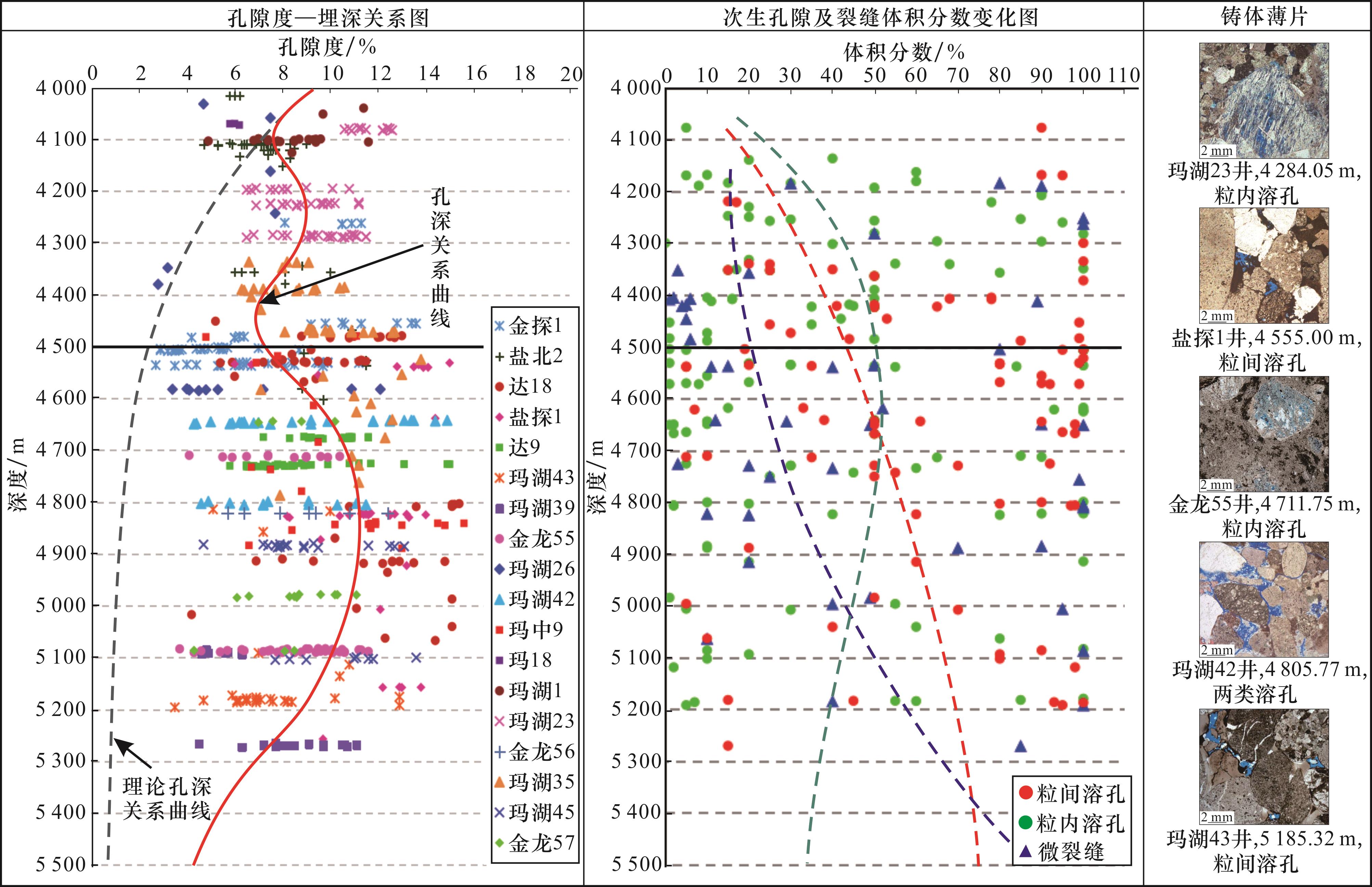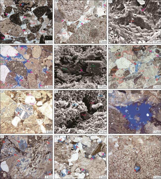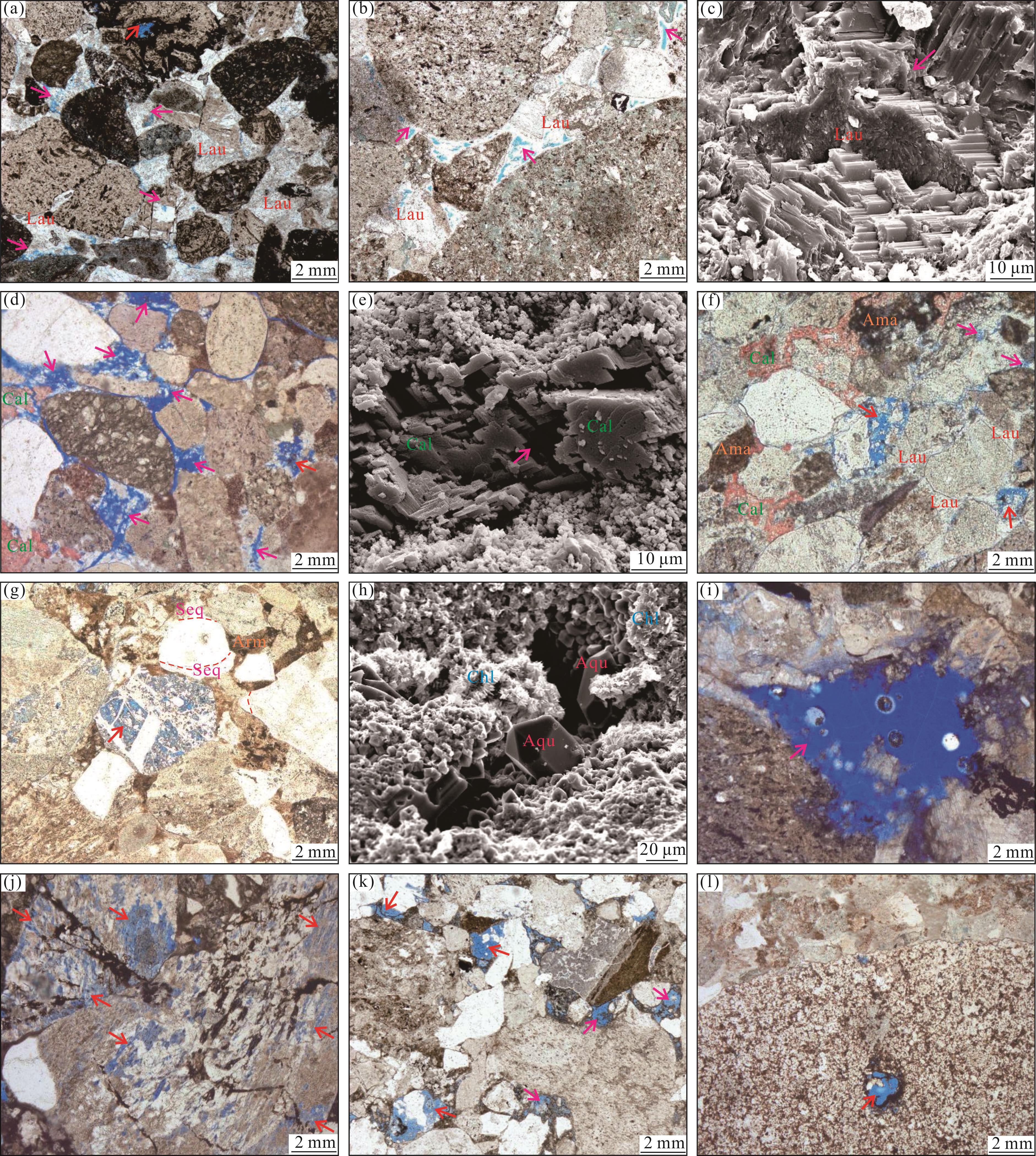 图5 玛湖地区深层致密砾岩储层成岩作用及孔隙特征(铸体薄片、扫描电镜)(a)浊沸石胶结物,浊沸石粒间溶孔和暗色矿物粒内溶孔(玛湖40井,4 536.03 m,P3 w);(b)浊沸石胶结物及粒间溶孔(玛湖39井,5 118.00 m,P2 x);(c)浊沸石胶结物及溶蚀现象(盐002井,4 642.97 m,P2 w);(d)方解石胶结物,浊沸石和方解石粒间溶孔、长石粒内溶孔(玛湖42井,4 805.77 m,P3 w);(e)方解石胶结物,方解石粒间溶孔(盐探1井,5 157.63 m,P2 w);(f)方解石和浊沸石胶结物,浊沸石粒间溶孔和长石粒内溶孔(达18井,4 917.13 m,P2 w);(g)石英次生加大,长石粒内溶孔(盐探1井,4 616.50 m,T1 b);(h)自生石英,绿泥石杂基(金探1井,4 504.12 m,P3 w);(i)方解石粒间溶孔(玛湖43井,5 173.00 m,P3 w);(j)长石粒内溶孔和杂基粒间溶孔(达10井,4 567.36 m,T1 b);(k)长石粒内溶孔(玛湖48井,4 745.50 m,P1 f);(l)暗色矿物粒内溶孔(玛中12井,4 667.05 m,P3 w)。注:Lau:浊沸石;Seq:石英次生加大;Aqu:自生石英;Chl:绿泥石;Cal:方解石;Ama:泥质杂基 Fig.5 Diagenesis and pore characteristics of deep tight conglomerate reservoirs in Mahu area(cast thin section, scanning electron microscope) |