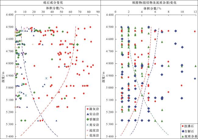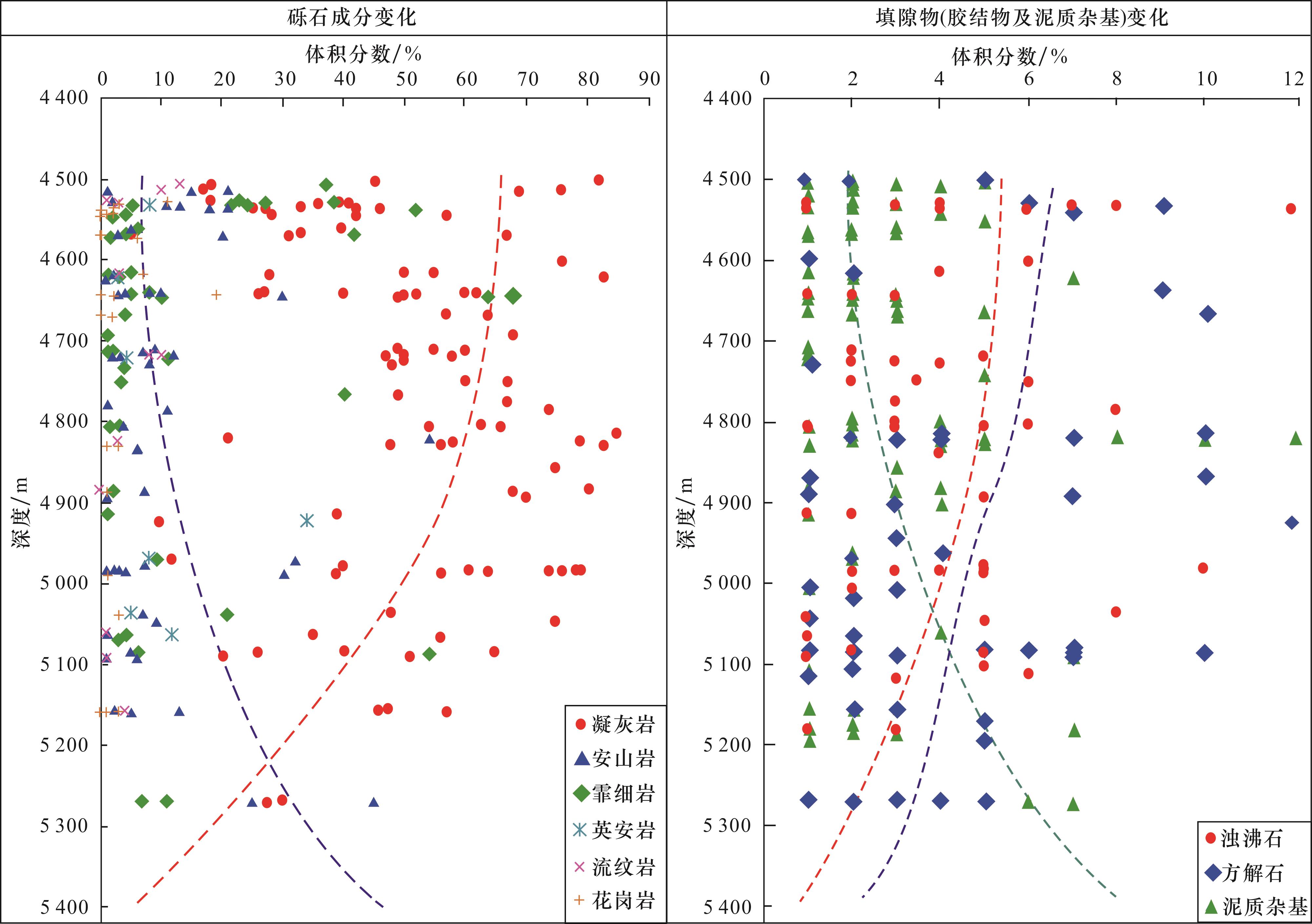 表2 玛湖地区深层砾岩储层填隙物类型及体积分数统计Table 2 Type and volume fraction table of interstitial material of deep conglomerate reservoir in Mahu area |
