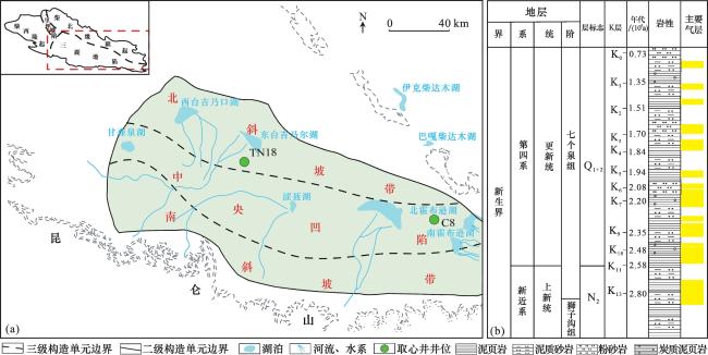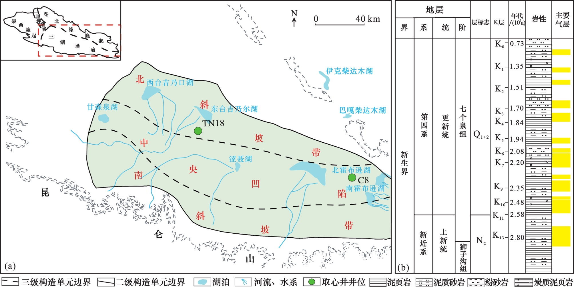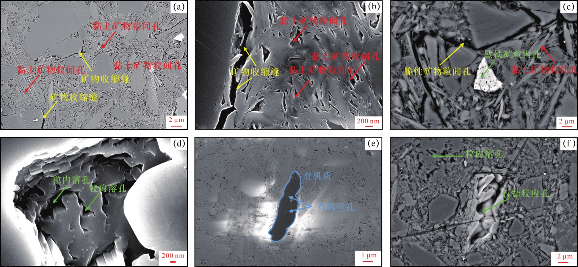 图5 三湖地区第四系七个泉组泥页岩样品储集空间特征(a)TN-1样品,2 μm尺度,黏土矿物粒间孔发育,埋深1 588 m;(b)TN-2样品,200 nm尺度,黏土矿物粒间孔发育,黏土矿物与脆性矿物收缩缝发育,埋深1 591 m;(c)TN-1样品,200 nm尺度,长石矿物粒内溶孔发育,埋深1 588 m;(d)TN-1样品,2 μm尺度,钛铁矿发育大量粒间孔,埋深1 588 m;(e)TN-1样品,2 μm尺度,石盐发育,存在石盐粒内孔隙,埋深1 591 m;(f)TN-1样品,1 μm尺度,三湖泥页岩有机质含量低,有机质孔匮乏,多呈孤立分布,连通性差,埋深1 591 m Fig.5 Spatial characteristics of mudshale reservoirs in the Qigequan Formation of Quaternary in the Sanhu area |