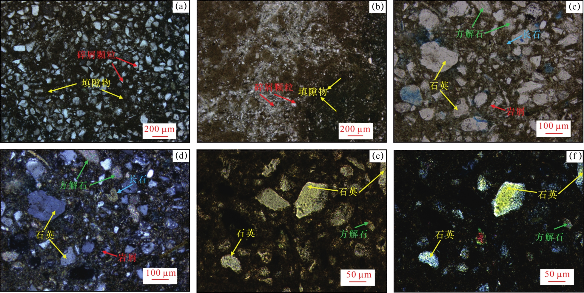 图4 七个泉组泥页岩岩石学特征(a)TN-1样品,200 μm,单偏光,碎屑颗粒呈漂浮状分布于泥质中;(b)C-1样品,200 μm,单偏光,碎屑颗粒呈漂浮状分布于泥质中;(c)TN-2样品,100 μm,单偏光,石英、长石和方解石颗粒呈漂浮状分布于泥质中;(d)TN-2样品,100 μm,正交偏光,石英、长石和方解石颗粒呈漂浮状分布于泥质中;(e)TN-3样品,50 μm,单偏光,石英颗粒,磨圆度较差,呈泥级—粉砂级;(f)TN-3样品,50 μm,正交偏光,石英颗粒,磨圆度较差,呈泥级—粉砂级 Fig.4 Petrology characteristics of mudshale in Qigequan Formation |
