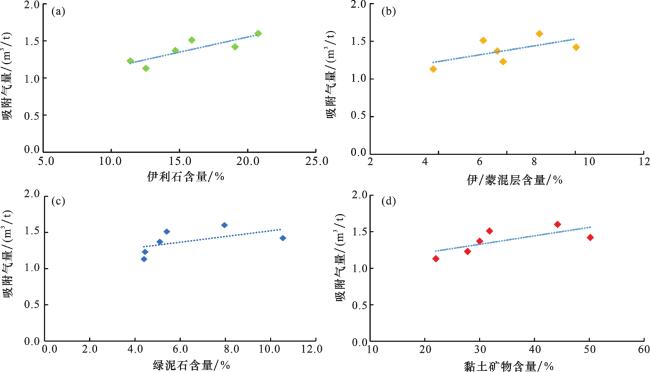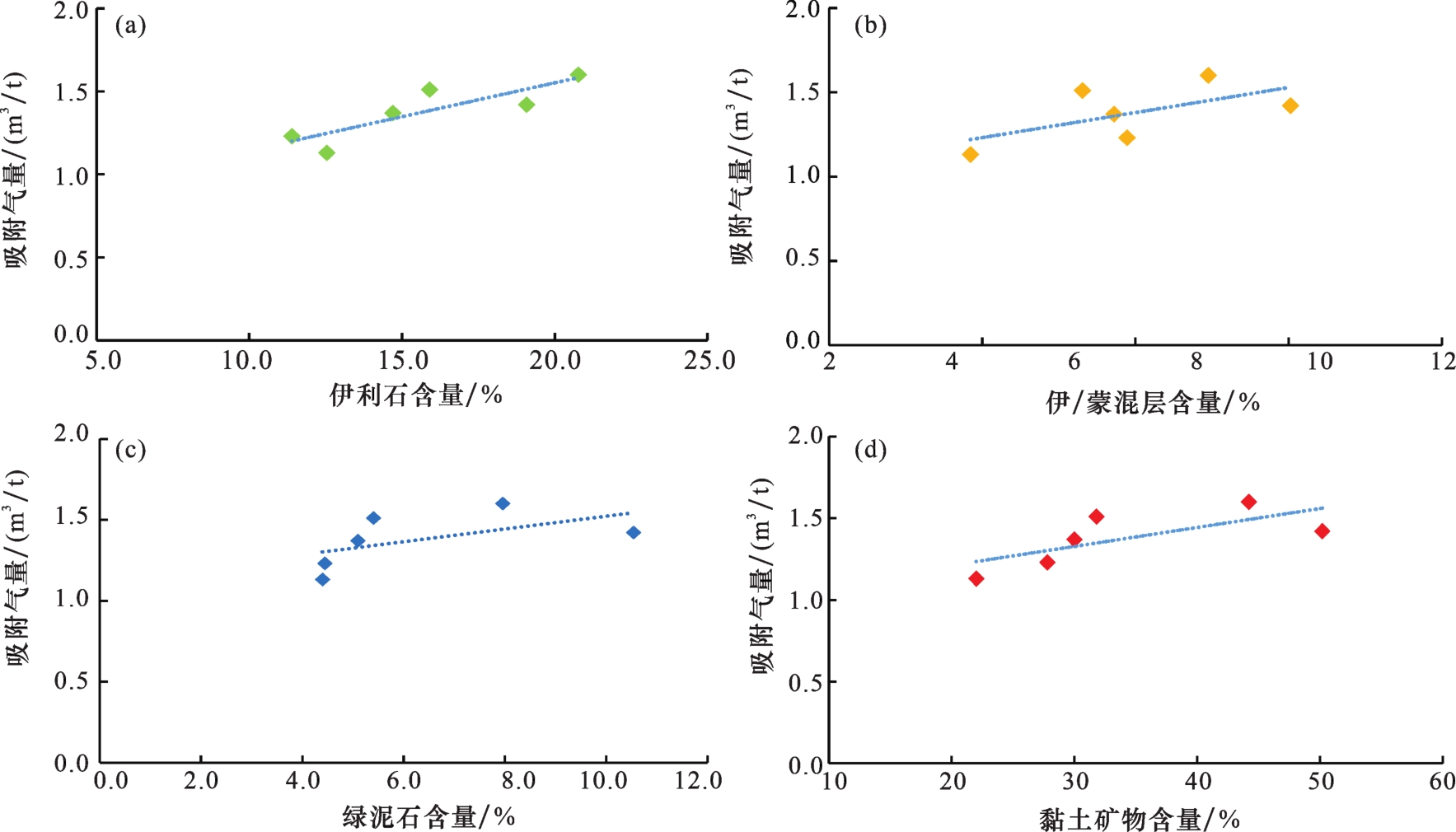 图11 三湖地区泥页岩吸附气量与黏土含量之间的关系Fig. 11 The relationship between the amount of gas adsorbed by mudshale and the clay content in the Sanhu area |