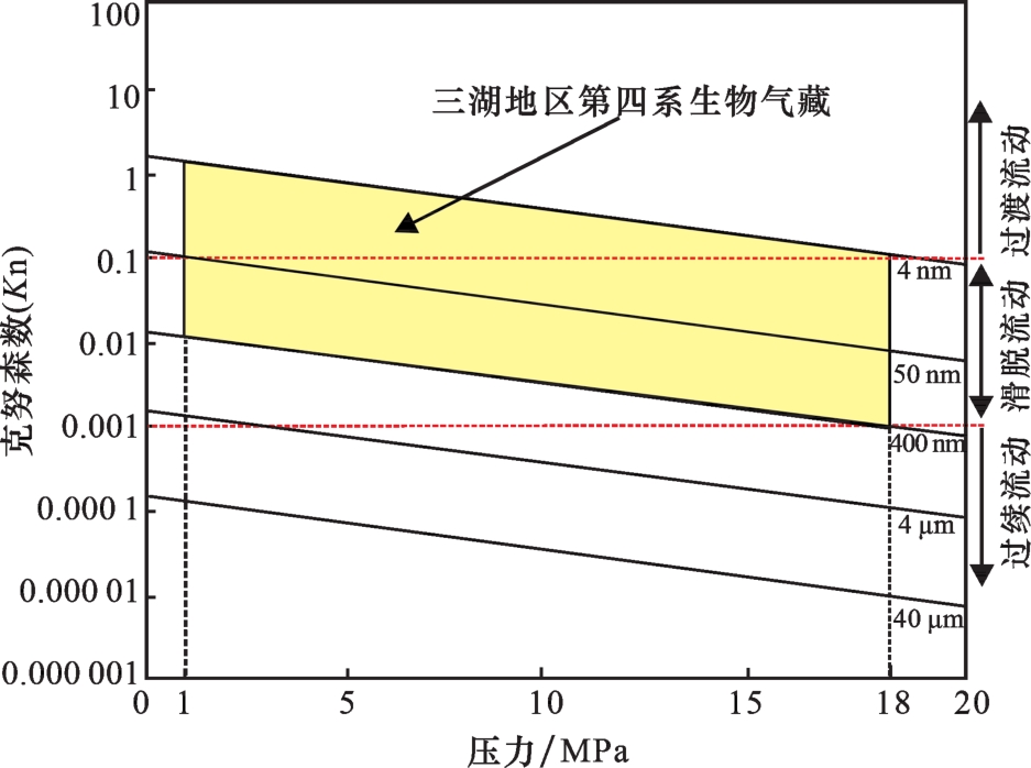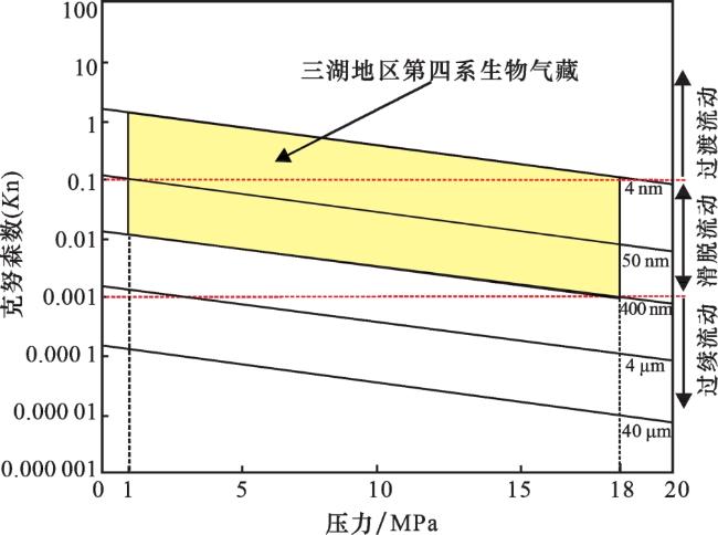 图13 三湖地区第四系七个泉组泥页岩不同纳米孔尺度下克努森数与压力关系曲线Fig.13 The relationship between Knudsen number and pressure in the mudshale of the Quaternary Qiquan Formation in the Sanhu area at different nanopore scales |