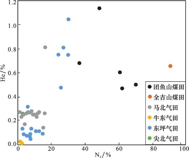 | 1 | 团鱼山 | KT-7-1 | 含煤侏 罗层系 | 874 | 49.06 | 0.73 | 48.58 | 1.14 | 6×10-8 | 0.05 | 0.043 | 远超 | 富氦 天然气 | 文献[7] | |