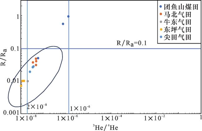 表5 柴北缘地区稀有气体含量特征(据韩伟等[9]简编)Table 5 Characteristics of rare gas content in northern margin of the Qaidam Basin (according to HAN et al.[9]) |