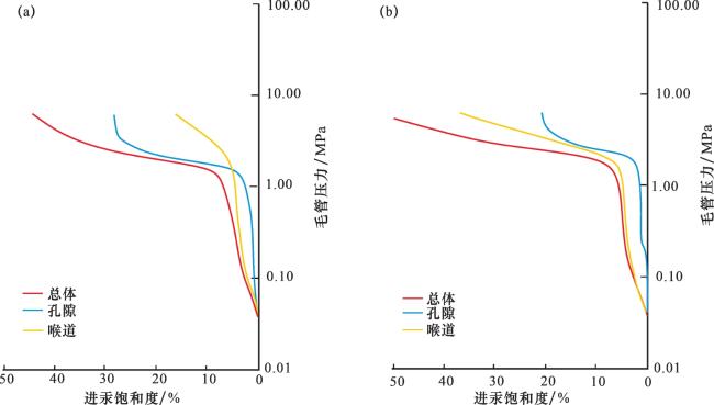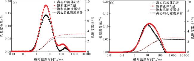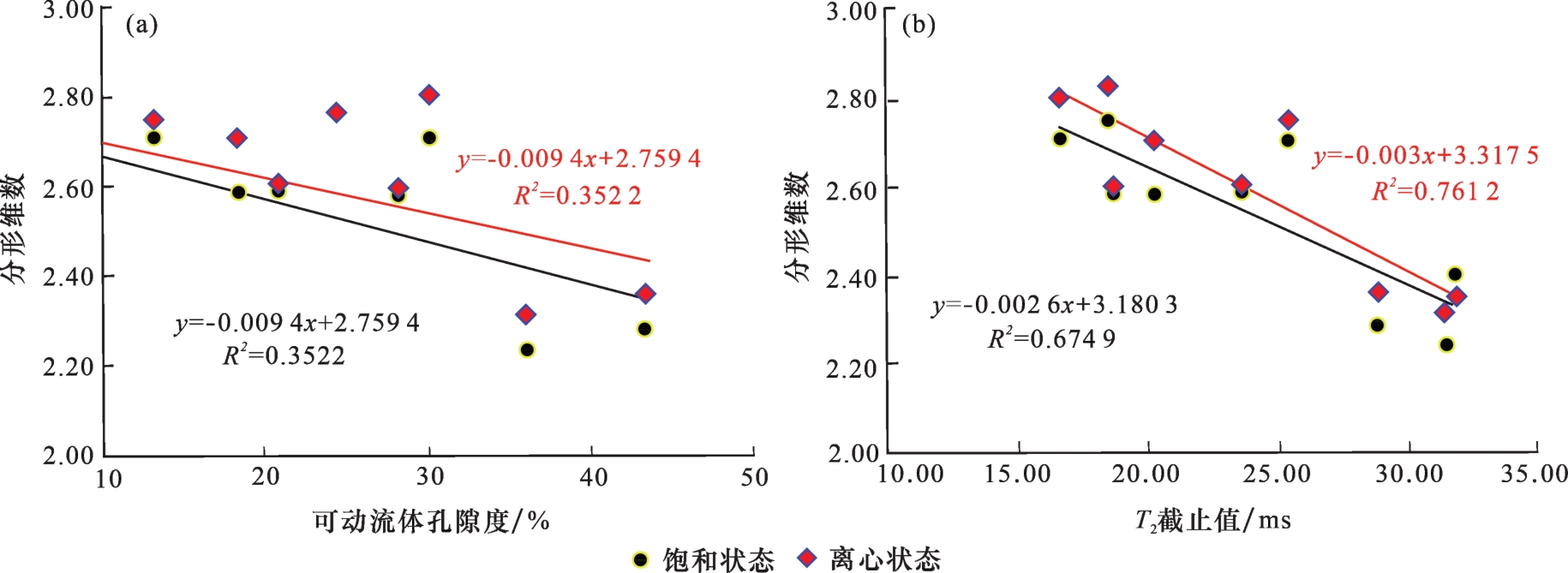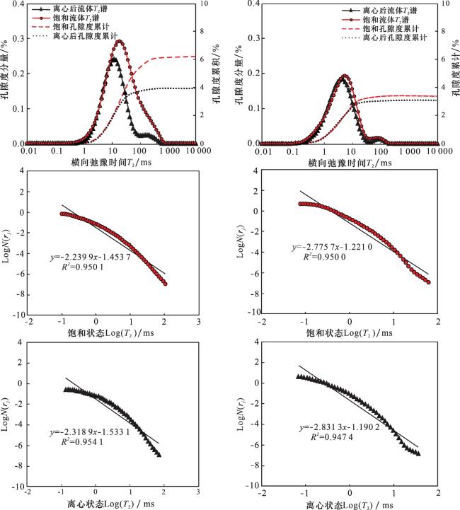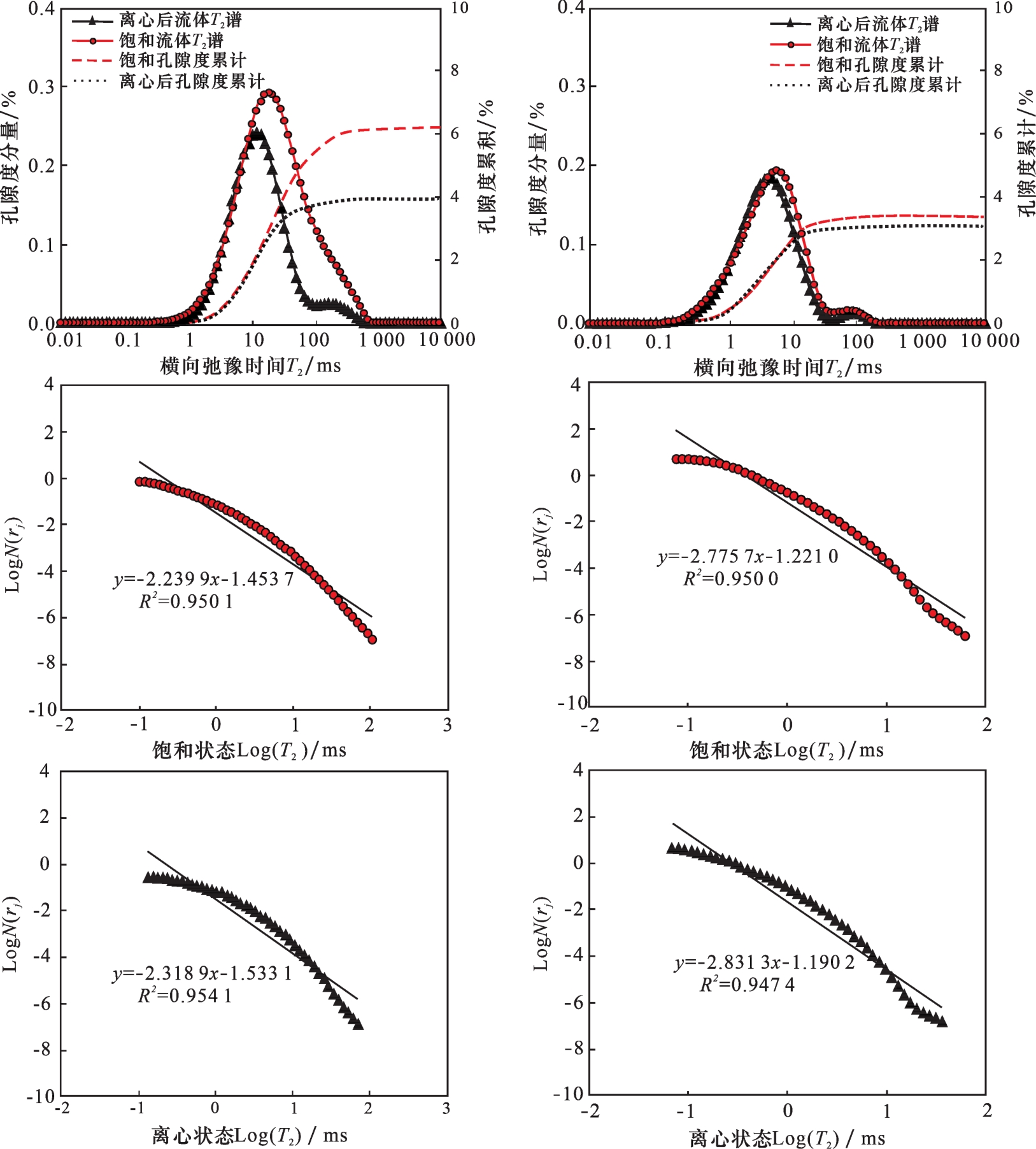 图7 登娄库组致密砂岩饱和和离心状态下分形特征曲线(a)S4样品 (b)S8样品 Fig.7 Fractal characteristic curves of tight sandstone under saturated and centrifugal conditions in Denglouku Formation |
