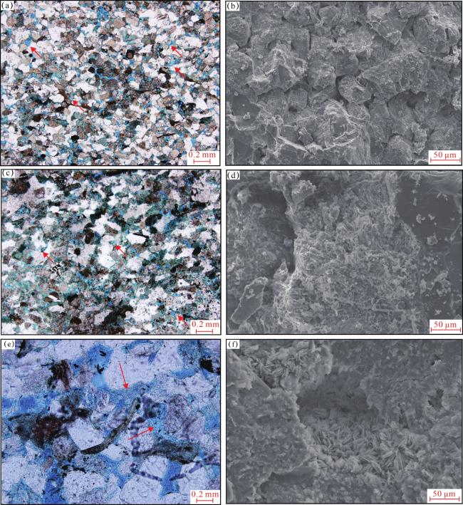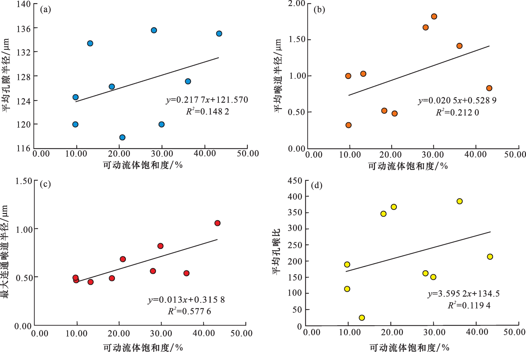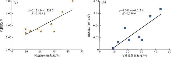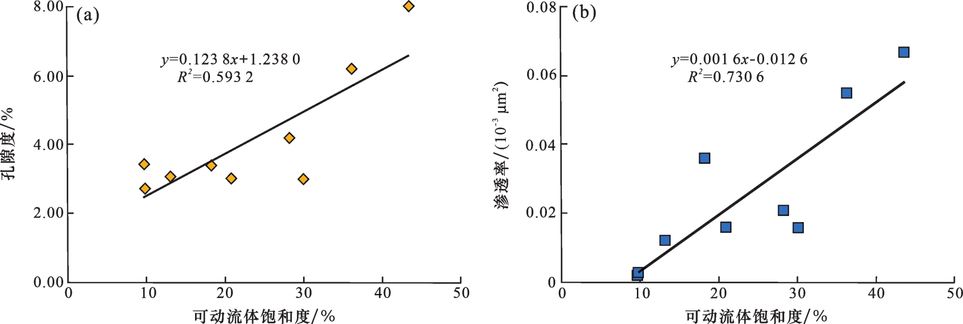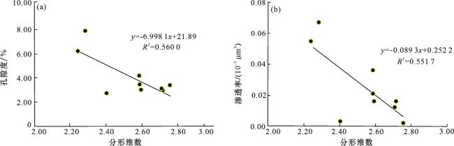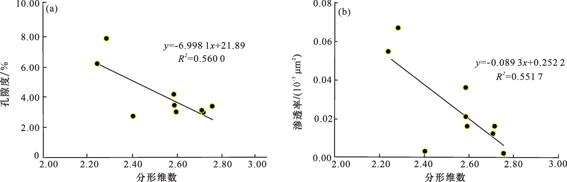 | 评价参数 | 孔隙度/% | 渗透率 /(10-3 μm2) | 可动流体饱和度/% | 孔隙类型 | 最大连通喉道半径/μm | 分形维数 | 代表样品 | |