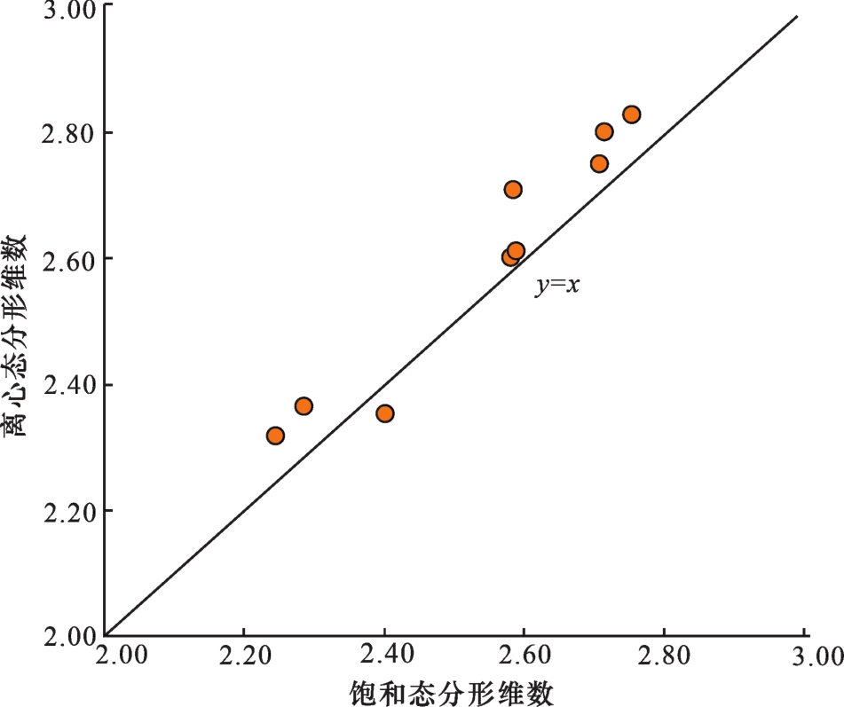 表2 登娄库组致密砂岩饱和和离心状态下的分形维数统计Table 2 Fractal dimension statistics of tight sandstone under saturated and centrifugal conditions in Denglouku Formation |