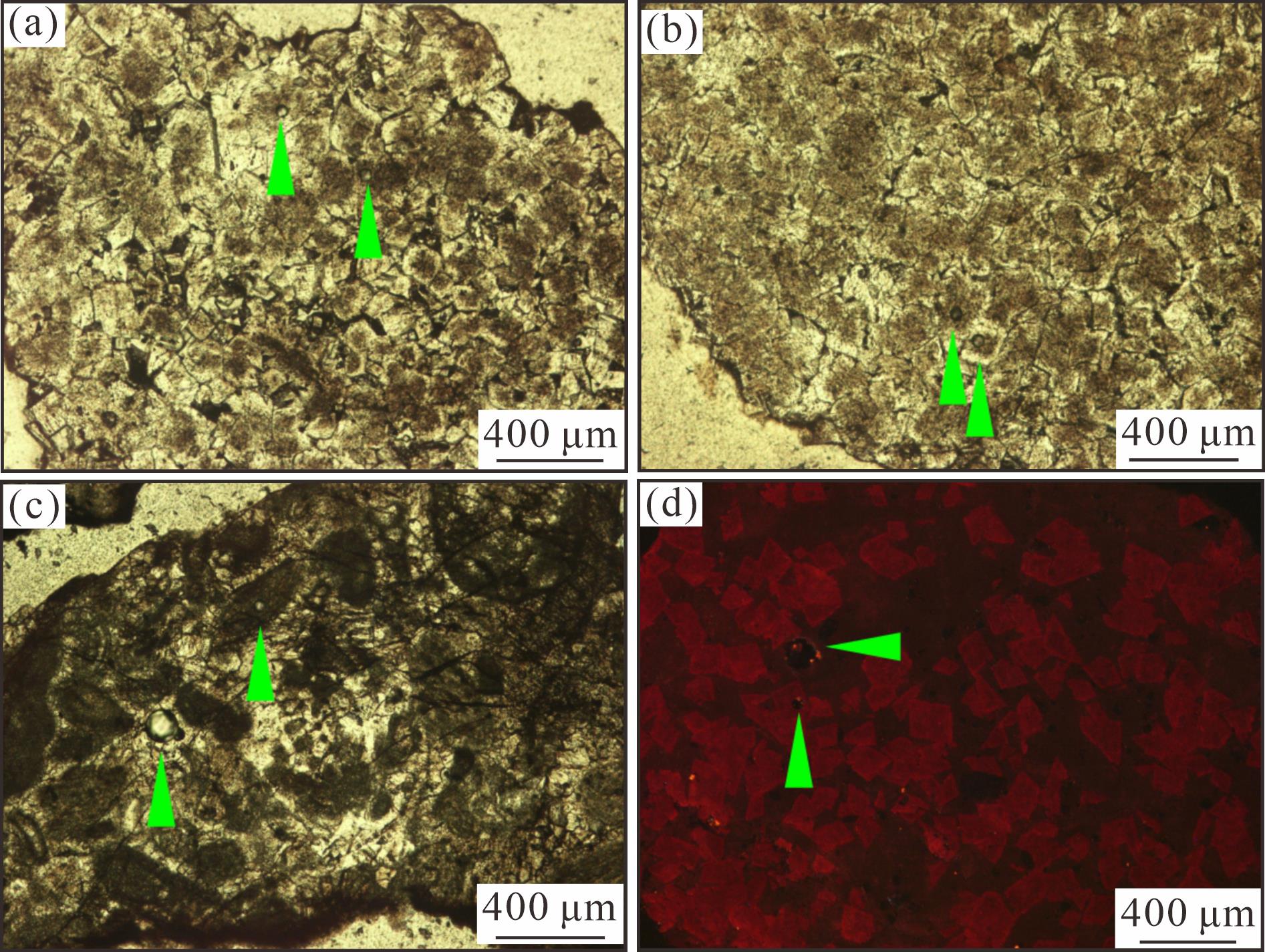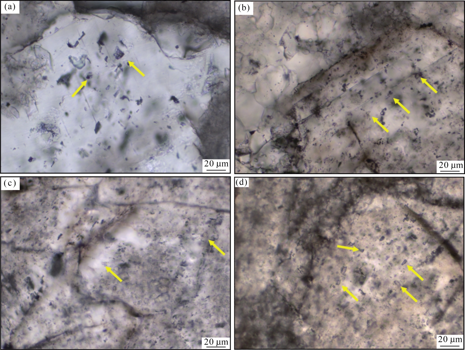 图11 角探1井茅二a亚段碳酸盐岩流体包裹体显微特征(a)方解石胶结物流体包裹体,尺寸为6 μm×3 μm(黄色箭头),6 166 m;(b)细—中晶白云石石流体包裹体,尺寸5 μm×3 μm(黄色箭头),6 162 m;(c)细晶白云石流体包裹体,尺寸7 μm×4 μm(黄色箭头),6 162 m;(d)鞍状白云石流体包裹体,尺寸7 μm×11 μm(黄色箭头),6 161 m Fig.11 Microscopic characteristics of carbonate fluid inclusions in the section IIa of Maokou Formation of Well JT1 |