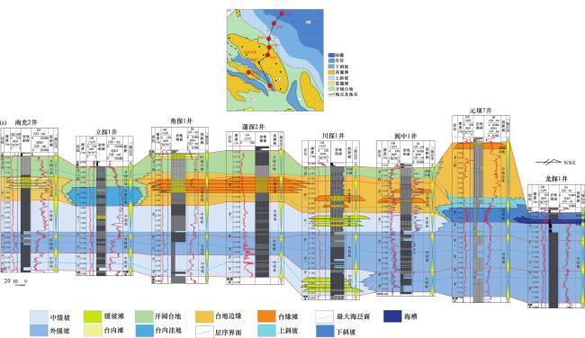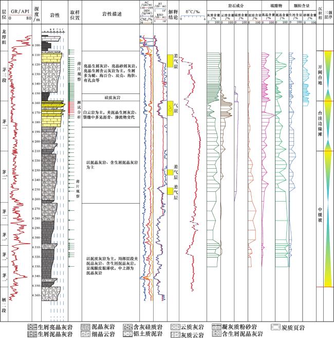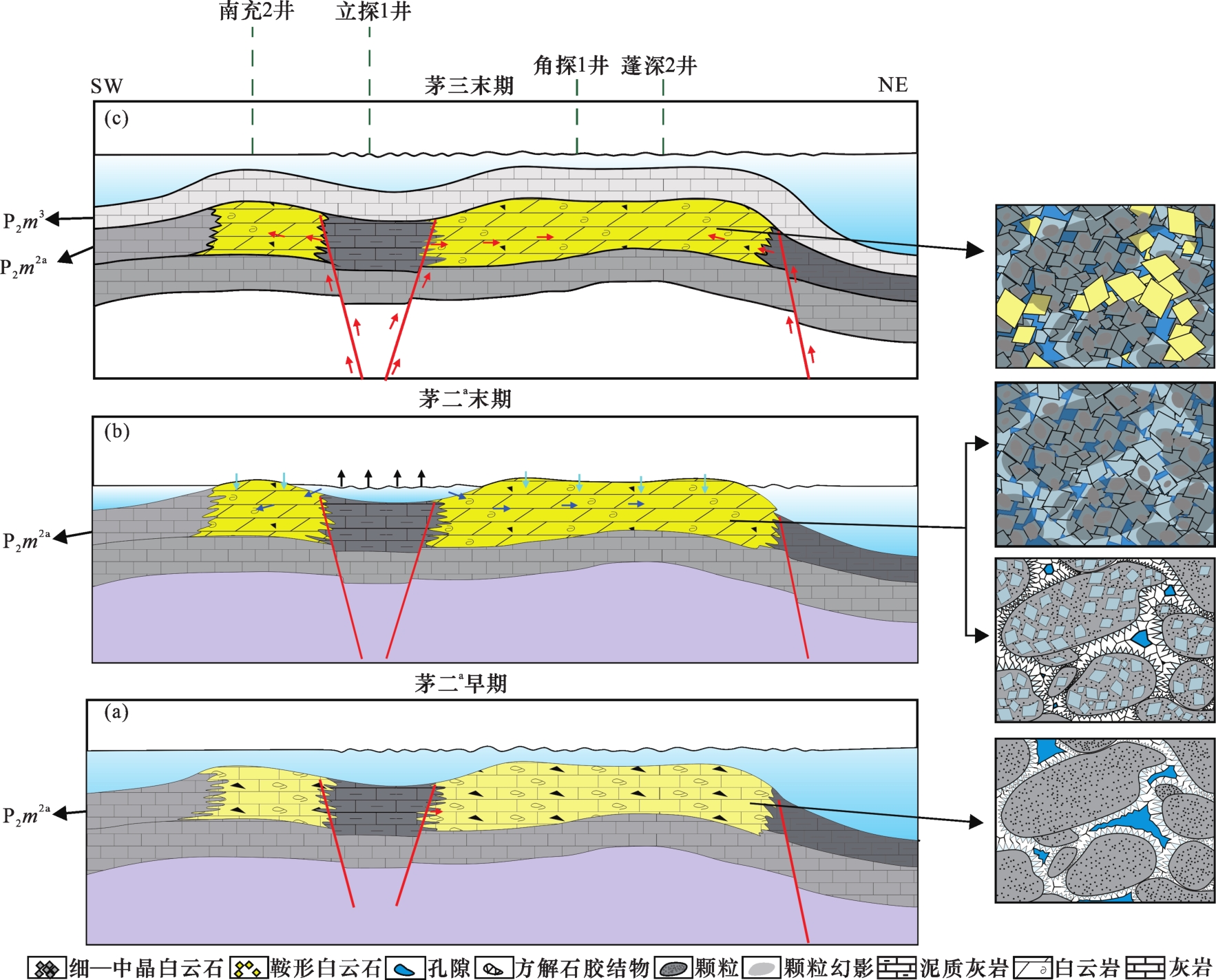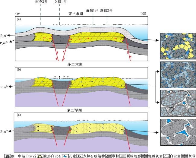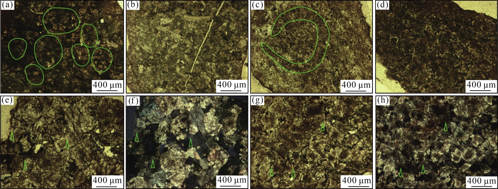 图5 角探1井茅口组白云石显微镜下特征(a)灰质云岩,可见颗粒幻影(绿圈所示),茅二a亚段,6 175 m;(b)灰质云岩,白云石颗粒交代泥晶灰岩,茅二a亚段,6 171 m;(c) 细—中晶白云岩,见生屑残余(绿圈所示意部分),茅二a亚段,6 161 m;(d) 细—中晶白云岩,可见雾心亮边,茅二a亚段,6 175 m;(e) 细—中晶白云岩,见晶间溶孔发育,铸体片;(f) 细—中晶白云岩,见晶间孔发育,铸体片;(g)、(h) 鞍状白云石,可见波状消光(绿色三角形所示位置),茅二a亚段,6 160 m,左PPL,右XPL Fig.5 Microscopic characteristics of dolomite in Maokou Formation of Well JT1 |