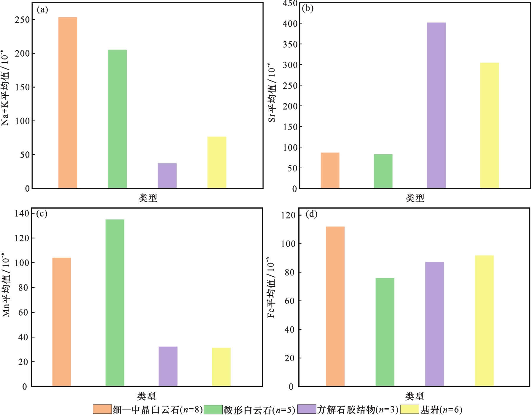 | 岩性 | Fe/10-6 | Mn/10-6 | Sr /10-6 | (Na+K)/10-6 | 阴极发光 | 点数/个 | |
