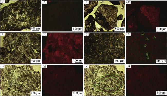 图6 角探1井茅二a亚段不同岩石类型的阴极发光(a)、(b) 砂屑亮晶灰岩,不发光—昏暗光,6 166 m;(c)、(d) 灰质云岩,鞍状白云石发红光—亮红光,基岩和方解石胶结物发昏暗光,6 162 m;(e)、(f) 鞍状白云石,发红光—亮红光,6 173 m;(g)、(h) 云质泥晶灰岩,白云石发暗红光,基岩和方解石胶结物不发光—昏暗光,6 175 m(绿色菱形为白云石晶粒);(i)、(j) 残余生屑云岩,热液白云石发红光—亮红光,细晶白云石发红光,6 161 m;(k)、(l):残余生屑云岩,细晶白云石发暗红光—红光,鞍状白云石发红光,6 161 m(绿圈为生屑颗粒幻影) Fig.6 Cathodoluminescence of different rock types in the section IIa of Maokou Formation of Well JT1 |