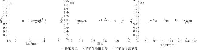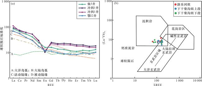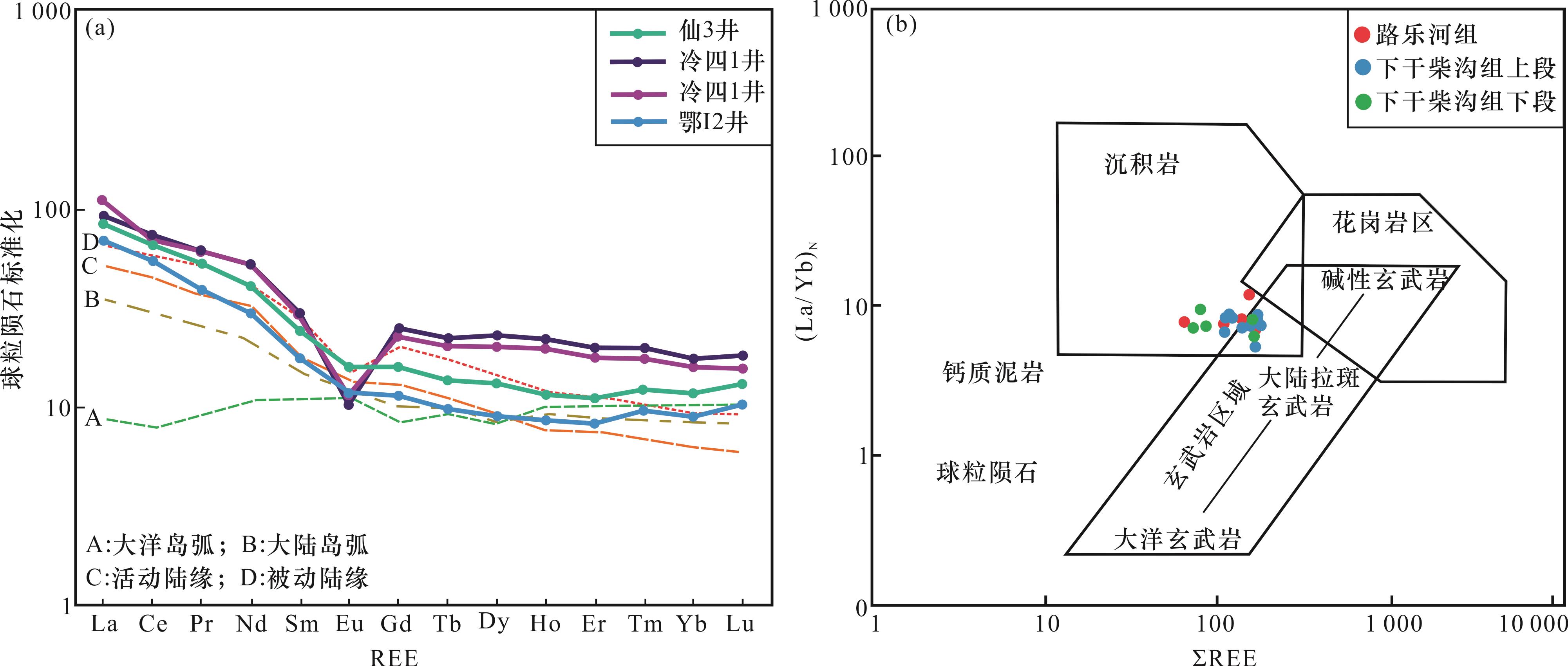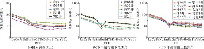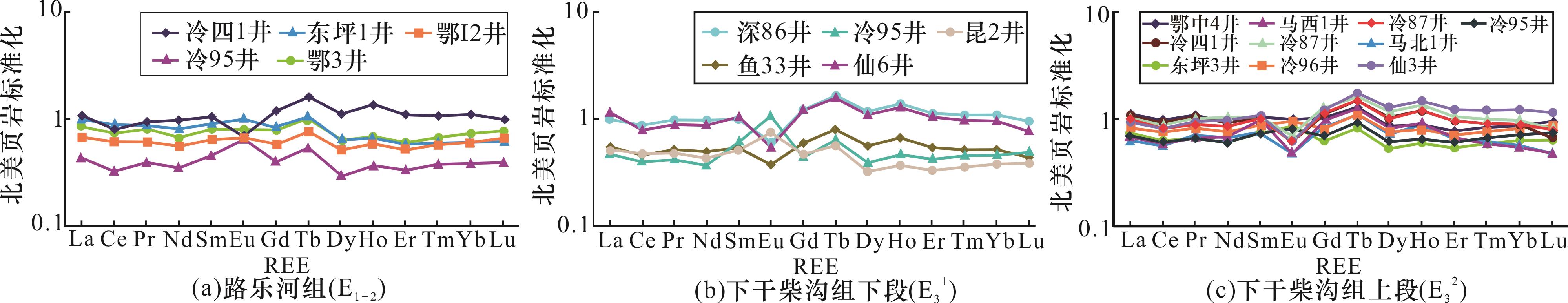 图4 柴北缘路乐河组和下干柴沟组稀土元素北美页岩标准化配分模式Fig.4 NASC normalized REE patterns of Lulehe and Xiaganchaigou formations in the northern margin of Qaidam Basin |