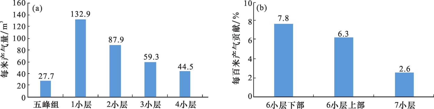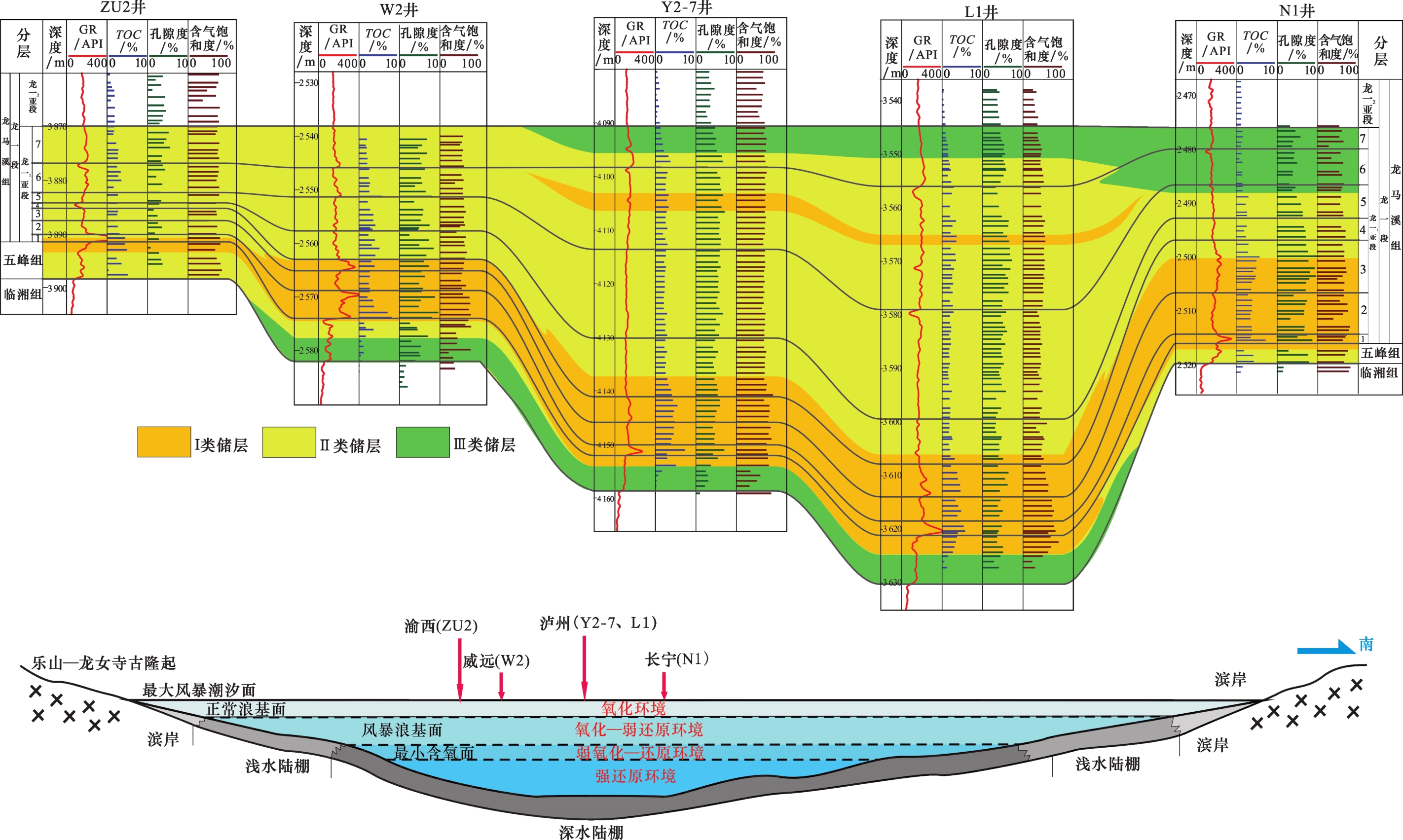 有机质的富集受古生产力、氧化还原环境、碎屑供给速度等沉积要素综合控制7。晚奥陶世—早志留世,四川盆地由临湘组的浅水碳酸盐岩台地向五峰组—龙马溪组的深水页岩陆棚转化,在五峰组内自下而上沉积水体逐渐变深,而在龙马溪组内自下而上沉积水体整体逐渐变浅;具体而言,五峰组—龙一1 4小层处于底层水环境、以长期缺氧还原条件为主,古生产力是影响有机质富集的主要因素。而龙一1 5小层—龙一1 7小层沉积时期逐渐由缺氧环境向贫氧环境转换,同时陆源碎屑供给增加,因此该时期有机质富集主要受控于氧化还原环境和碎屑供给速度14。受此影响,川南地区五峰组—龙一1亚段储层在纵向上呈明显“分层性”(图2),即五峰组上部—龙一1 4小层下部储层品质好,TOC大于3%、孔隙度普遍大于4%、含气量普遍大于4 m³/t,整体为纵向连续分布的Ⅰ类储层;在龙一1 4小层上部—龙一1 6小层主要发育厚Ⅱ类储层,仅局部区域因短期海侵而沉积水体短暂变深、在龙一1 6小层中下部发育厚2~6 m的Ⅰ类储层;而在五峰组下部、龙一1 7小层发育Ⅱ类—Ⅲ类储层。