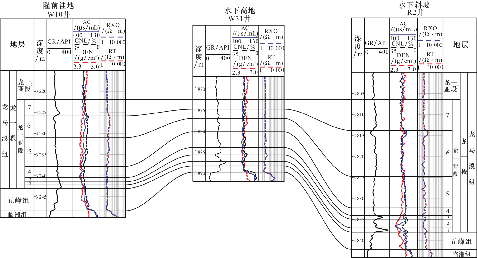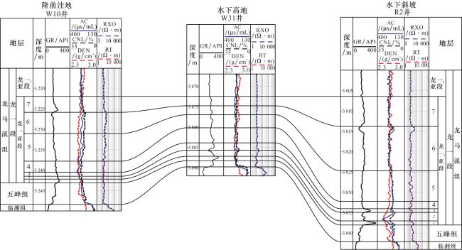 五峰组—龙马溪组是深水陆棚沉积环境下发育形成的连续海相页岩地层,其中五峰组—龙一1亚段为目前开发目的层,岩性以硅质页岩、黏土质页岩为主,夹少量钙质页岩3。中国石油在川南地区依据纵向岩性、电性、沉积旋回、古生物等特征,建立了五峰组—龙一1亚段“八分”小层的地层格架(即自下而上发育五峰组、龙一1 1小层、龙一1 2小层、龙一1 3小层、龙一1 4小层、龙一1 5小层、龙一1 6小层、龙一1 7小层等8个小层),在全区可对比8-9图2)。
