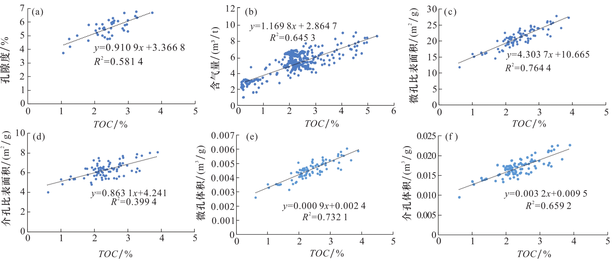 (d)介孔(2~50 nm)比表面积与TOC的关系; (e)微孔(<2 nm)体积与TOC的关系; (f)介孔(2~50 nm)体积与TOC的关系