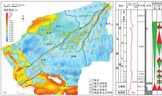 图1 川南地区五峰组—龙马溪组构造背景(a)及地层综合柱状图(b)