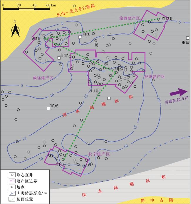图5 川南地区五峰组—龙一1亚段沉积相与Ⅰ类储层平面展布(沉积相平面图、Ⅰ类储层厚度等值线据文献[7]修改)
