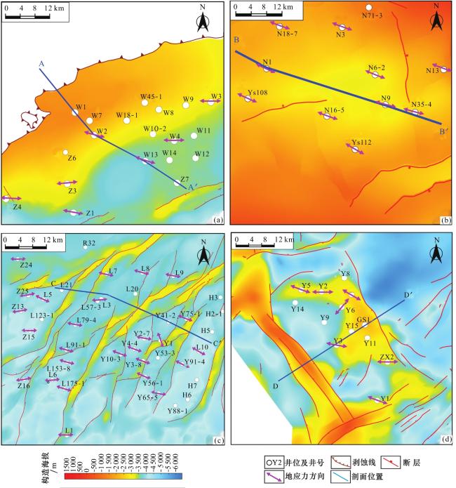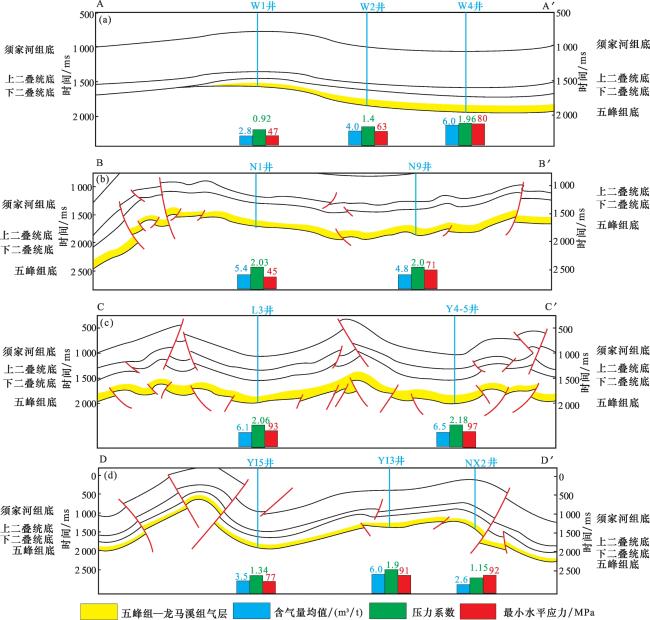 区域地应力背景控制了构造变形,构造变形程度决定了断层分布和组合样式,断层形态决定了地层变形和天然裂缝发育特征,从而进一步控制页岩气的保存和富集22。同时,地应力场是影响页岩气体积压裂改造效果的关键因素。现今地应力大小及两向水平应力差值决定了人工裂缝起裂方式与压裂施工难易程度,地应力、应力差值越小,越利于形成复杂人工缝网23。而三轴应力的相对大小关系影响了压裂缝的类型,当σ v最大(即σ v>σ H>σ h)时,压裂缝沿σ H方向扩展,形成垂向缝,压裂效果相对较好;当σ v居中(即σ H>σ v>σ h)时,压裂缝沿σ v方向扩展一定程度,压裂缝在纵向和向平面远端延伸的难度增大,压裂效果变差24