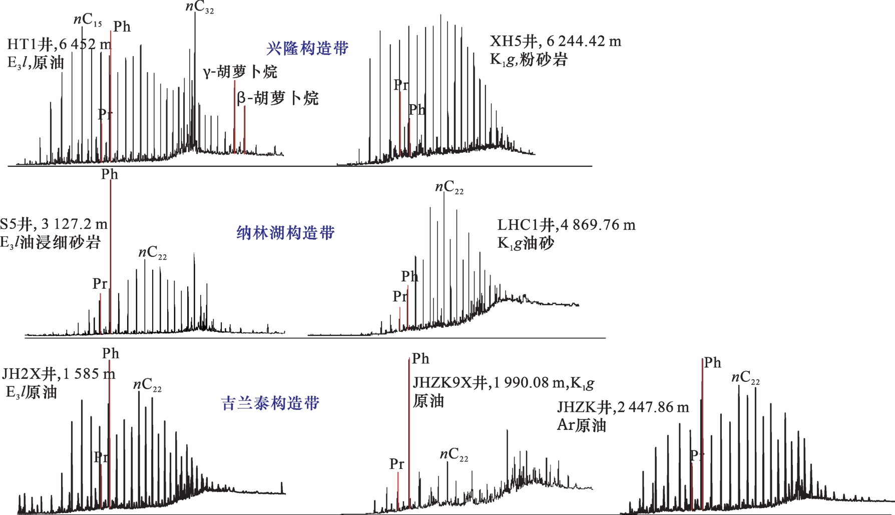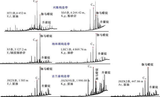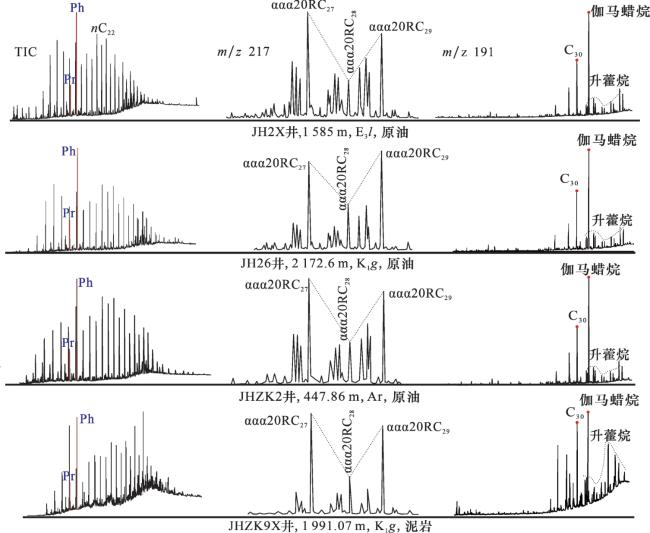 图8 河套盆地临河坳陷不同构造带原油典型饱和烃m/z 191质量色谱Fig.8 m/z 191 mass chromatograms of typical saturated hydrocarbons in different structural zones of Linhe Depression in Hetao Basin |